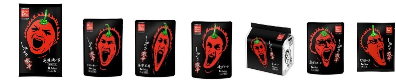 *画像左から、<麻辣鍋の素>、<チキンカレー>、<麻婆豆腐>、<辛ボナーラ>、<ラーメン>、<辛ボロネーゼ>、<炒飯の素>