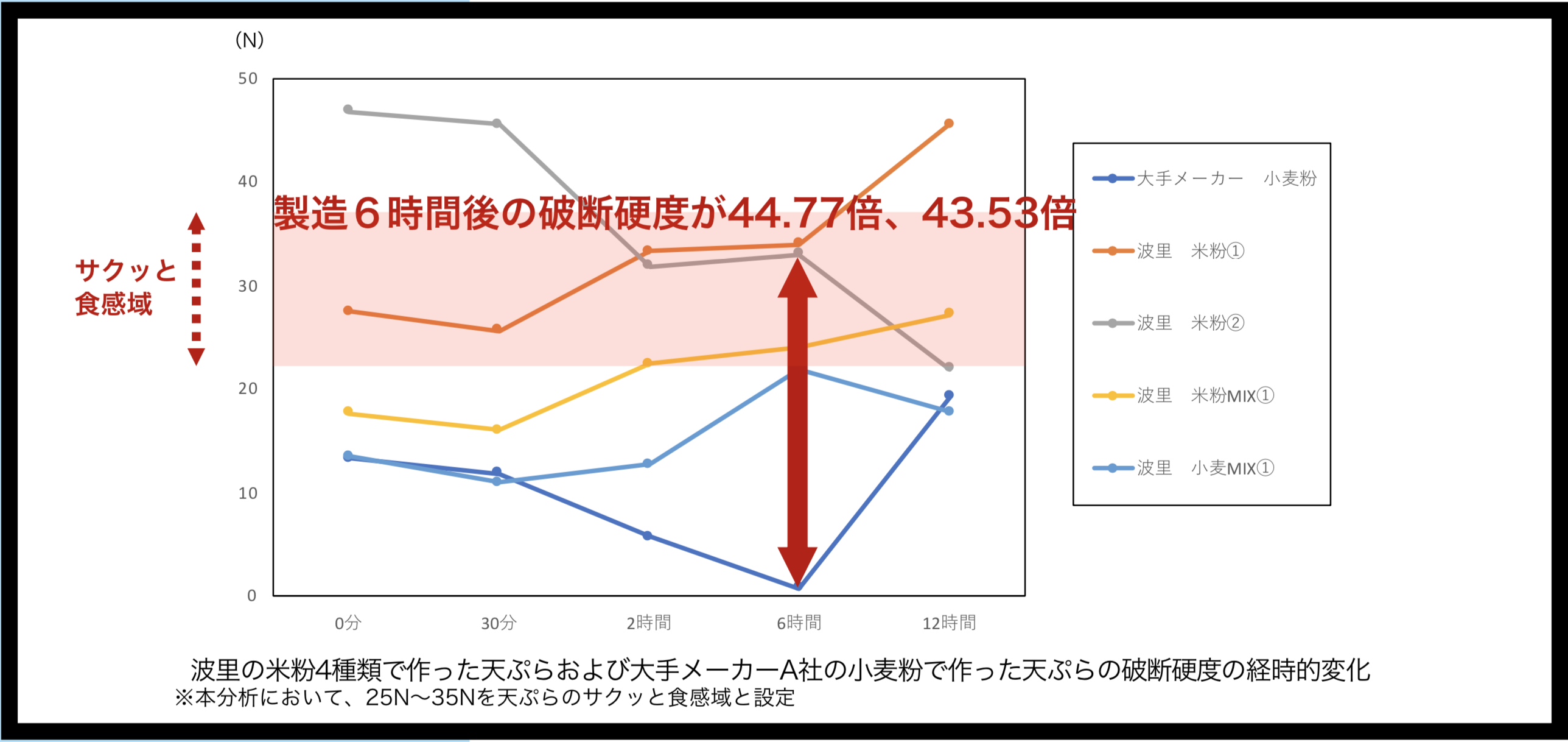 天ぷらの硬さを表す破断硬度について、製造後6時間後の波里の米粉①および米粉②で作った天ぷらの破断硬度は、大手メーカーA社の小麦粉で作った天ぷらより44.77倍、 43.53倍高い。
