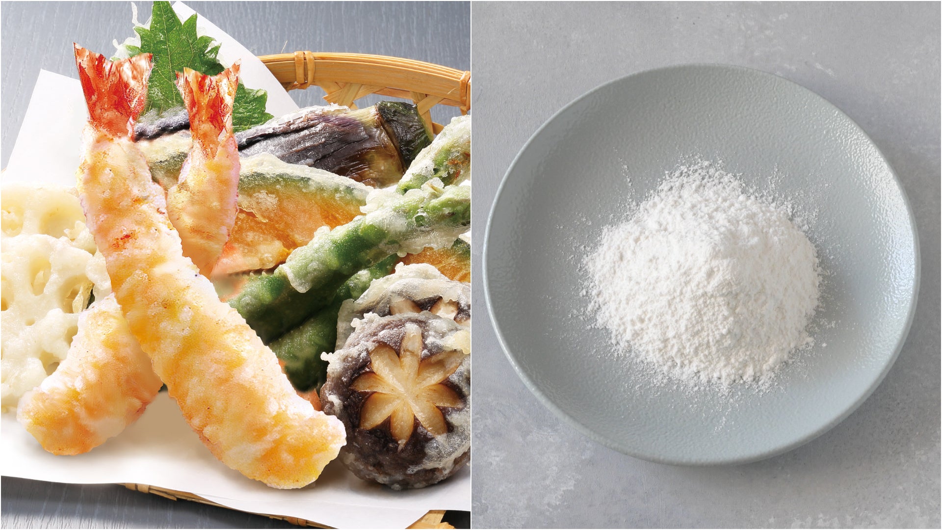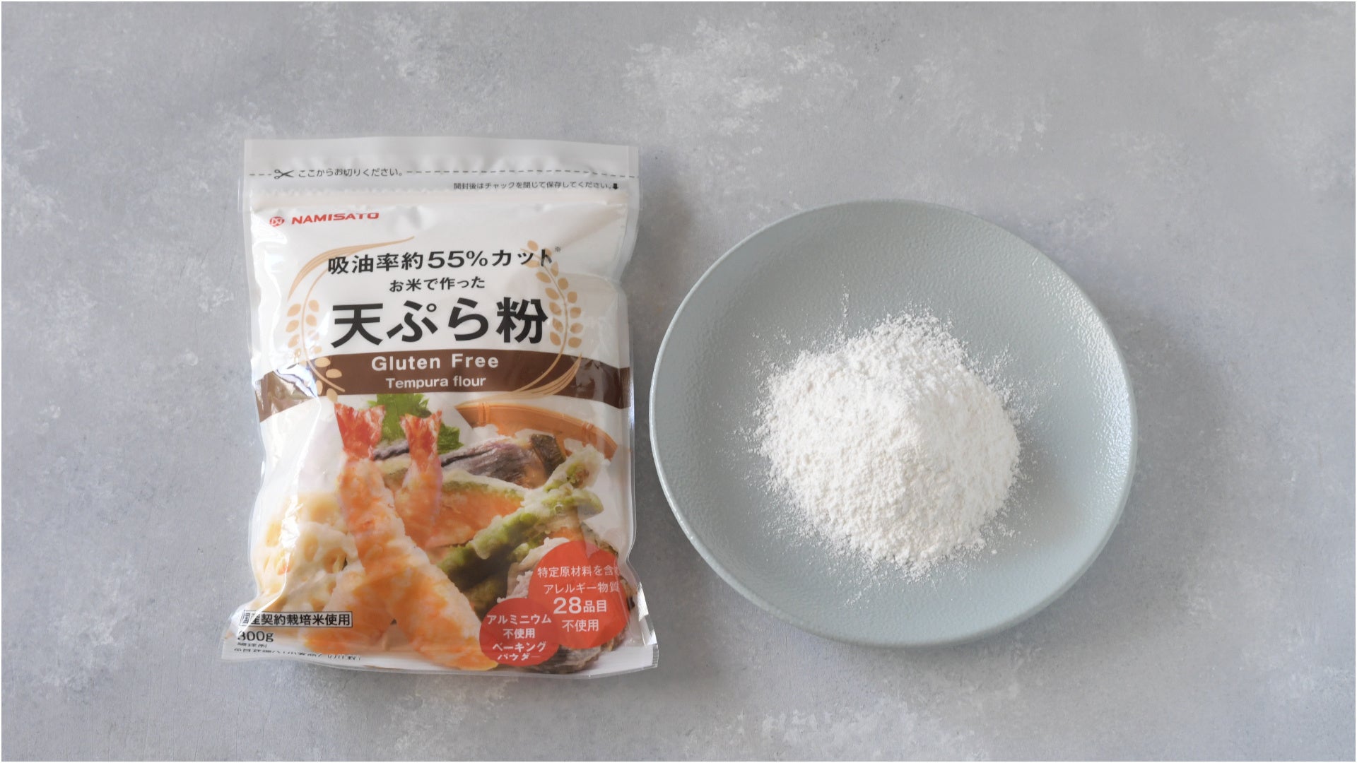 そんな米粉の使用方法として最近特に注目されているのが天ぷらです。一般的に米粉は小麦粉と比べて吸油率が25%程度低いとされており、グルテンを含まないのも特徴です。そのため、揚げ物がベタッとすることなくサクッと軽く、さらにさっぱりヘルシーに仕上がります。このような評判を受けて、波里では今年2月に「お米で作った天ぷら粉」をリリース。天ぷらに最適な細かさに製粉した国産米粉を主原料に、ふっくらと仕上げるでんぷんなどを加え、使い勝手のよい天ぷら粉を開発しました。「お米で作った天ぷら粉」を使った天ぷら作りは驚くほど簡単です。まず材料は「お米で作った天ぷら粉」と水のみ。卵は不要です。グルテンを含まない米粉は固まりづらくサラサラしているので、ふるいにかけなくてOKというのも嬉しいポイント。さらに水と混ぜても粘りが出ないので、冷水を用意する必要も、粉と水の混ぜ具合に悩むこともありません。そうしてできた衣液にお好みの具材をさっとくぐらせ、あとは普通の天ぷら同様に170~180℃の油で揚げるだけ。小麦も卵も使わないので、アレルギーの方も安心して天ぷらが楽しめるうえ、近年注目されているグルテンフリーにも対応しています。米にはアミノ酸が含まれているため、自然な旨味がプラスされるのも米粉の天ぷらならではの魅力です。