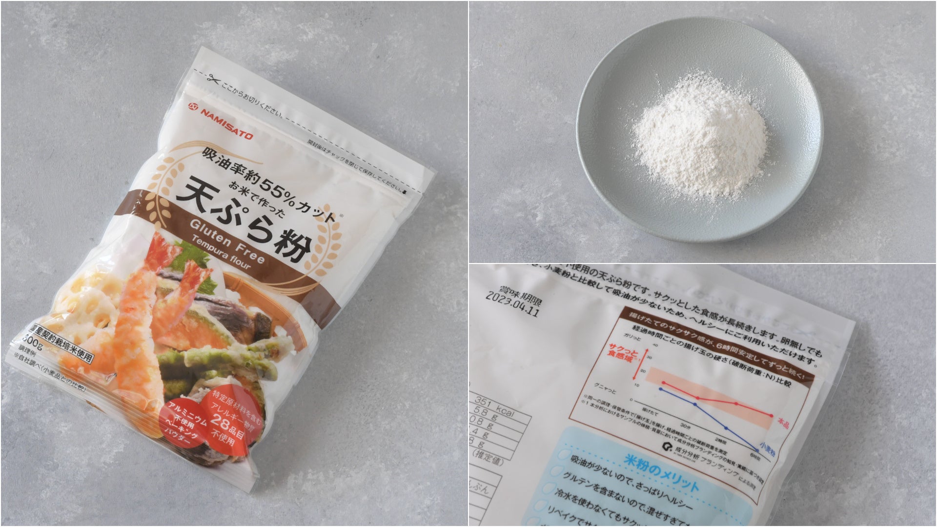 波里の米粉で作った天ぷらは時間経過しても硬度が保たれていることから、波里の米粉はサクッと感が持続される天ぷら粉であることが明らかとなりました。理由として、米粉で作った天ぷら衣が油を吸収しづらいということが挙げられます。米粉は吸油率が低いため、時間経過による油の滲出が少なく、サクッと感が維持されます。一般的に米粉の吸油率は小麦粉に対して25%程度低いとされています。