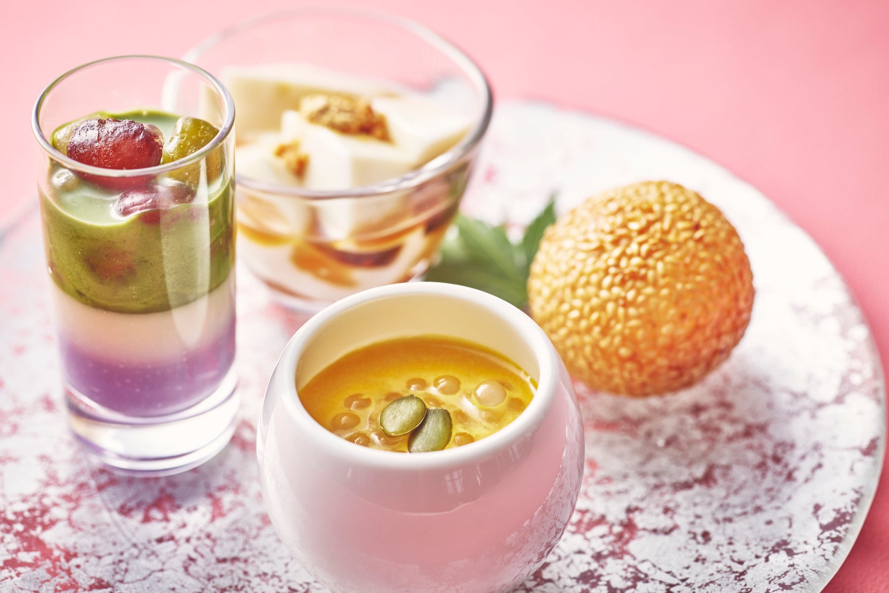ースの見た目も可憐なグラスデザート。金時豆、ひよこ豆、白いんげん豆を添えて