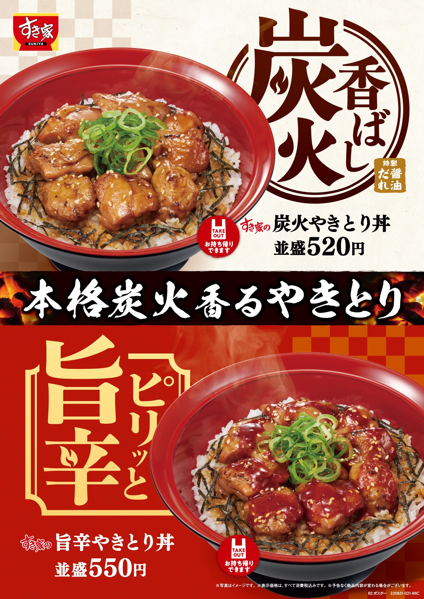 同時に販売する「旨辛やきとり丼」は、「炭火やきとり丼」に唐辛子ベースのピリッと辛いすき家オリジナルの旨辛だれをかけた商品で、香ばしいやきとりの味わいにアクセントを加えます。