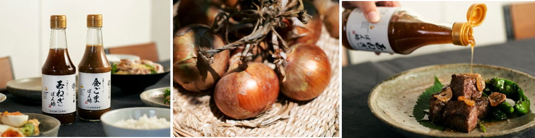 「金ごまぽん酢」は、ごま本来の濃厚な香りと深いコクのある風味が特長の金ごまを2種類(すりごま・ねりごま)を使用しています。金ごまは、生産量や輸入量が少ないので希少価値が高く、黒ごまや白ごまと比較しても旨味や風味がよいと言われています。金ごまのコクと相性が良い橙(だいだい)果汁とお酢を加え、後味を爽やかに仕上げました。2種類の醤油と鶏や魚介から抽出したエキスを加えており、玉ねぎベースの奥深い旨味を味わえます。
