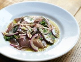 下味をつけて焼き上げたステーキに「玉ねぎぽん酢」をかけて完成させます。玉ねぎの甘さが肉や野菜の旨味を引き立てます。