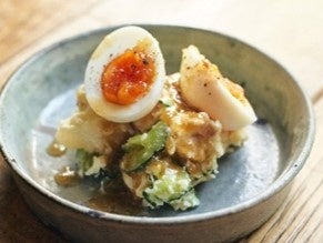 いつものポテトサラダに「玉ねぎぽん酢」をかけるだけです。玉ねぎぽん酢の甘酸っぱさが、トッピングのトロッとした半熟卵や粗挽き黒こしょうに良く合います。