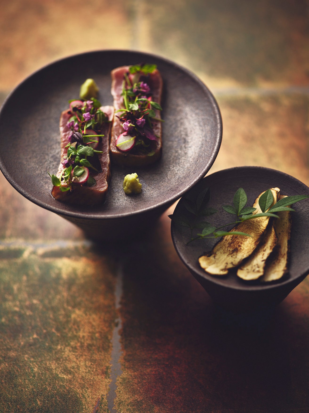 紅紫蘇やラディッシュを上質の本鮪に添えて、フレンチスタイルの華やかな装いに。松茸は目の前で炙って仕上げます。余計なものはくわえず、まずはそのままの味をわさび醤油で。