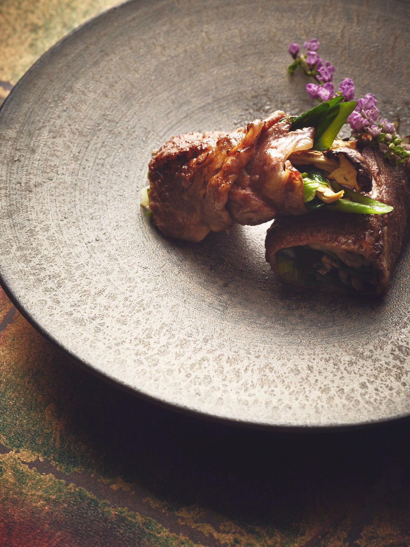 とした、やわらかい舌触りに。たっぷりの九条葱と松茸を包み、梅ポン酢