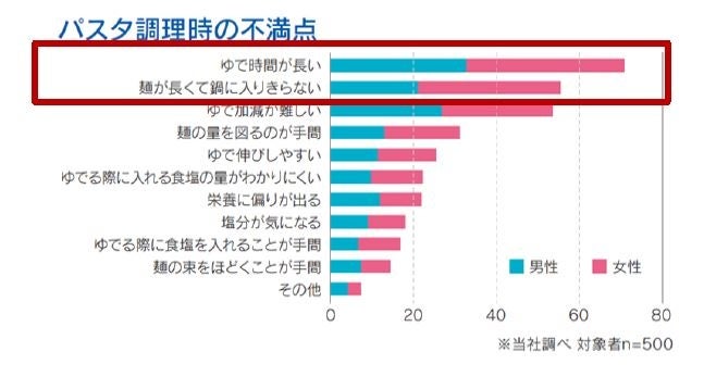 - パスタ調理の不満点は「ゆで時間が長い」「麺が長くて鍋に入りきらない」