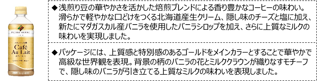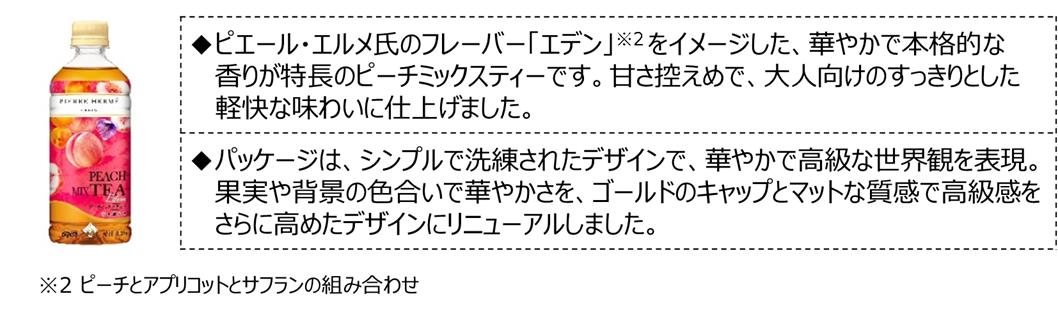 そして今回、この2品を、ご好評いただいた味わいと世界観をさらに強化しリニューアル。「ピエール・エルメ×贅沢香茶 ピーチミックスティー」は、ピーチとアプリコット、隠し味のサフランが織りなすピーチミックスティーの味覚を強化。「ピエール・エルメ×ダイドーブレンド パティシエ特製カフェ・オ・レ」は、隠し味にバニラシロップを加え、甘さ控えめながら、より深いミルクのコクが感じられる味わいに強化。洗練された高級感と華やかさを感じていただくことで、忙しい毎日に、気分転換ができるひとときをお届けします。
