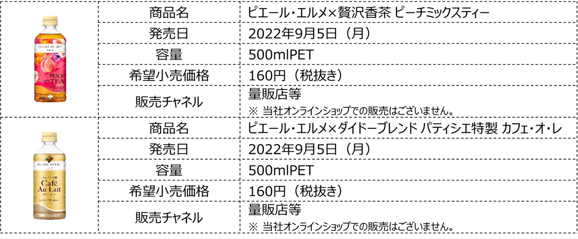 ダイドードリンコ株式会社は、2022年秋冬の新商品として、「ピエール・エルメ×贅沢香茶 ピーチミックスティー」と、「ピエール・エルメ×ダイドーブレンド パティシエ特製カフェ・オ・レ」を9月5日(月)より発売いたします。