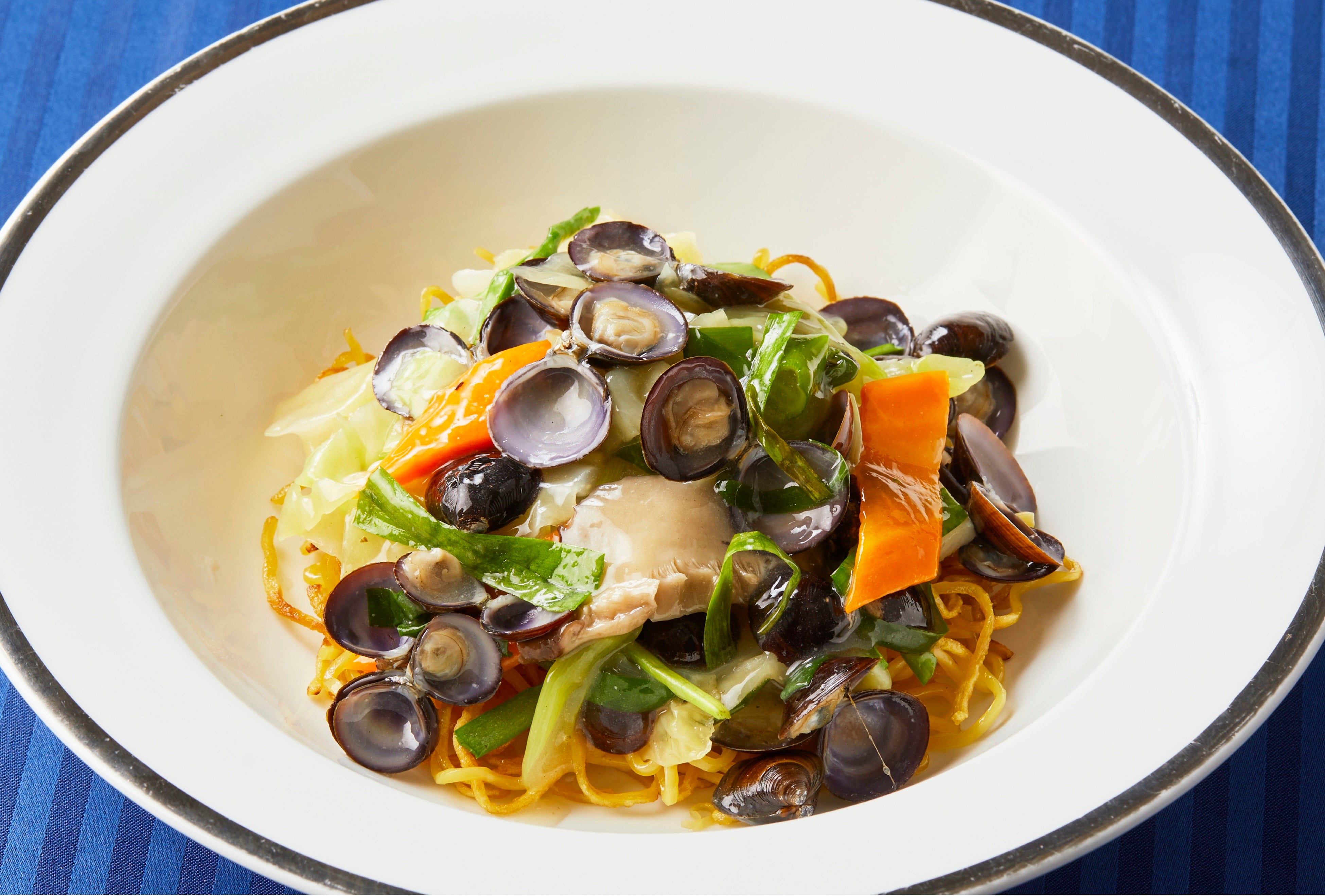 小川原湖で採れたしじみの旨味が凝縮した餡に、香ばしい麺を絡めてお召し上がりください。