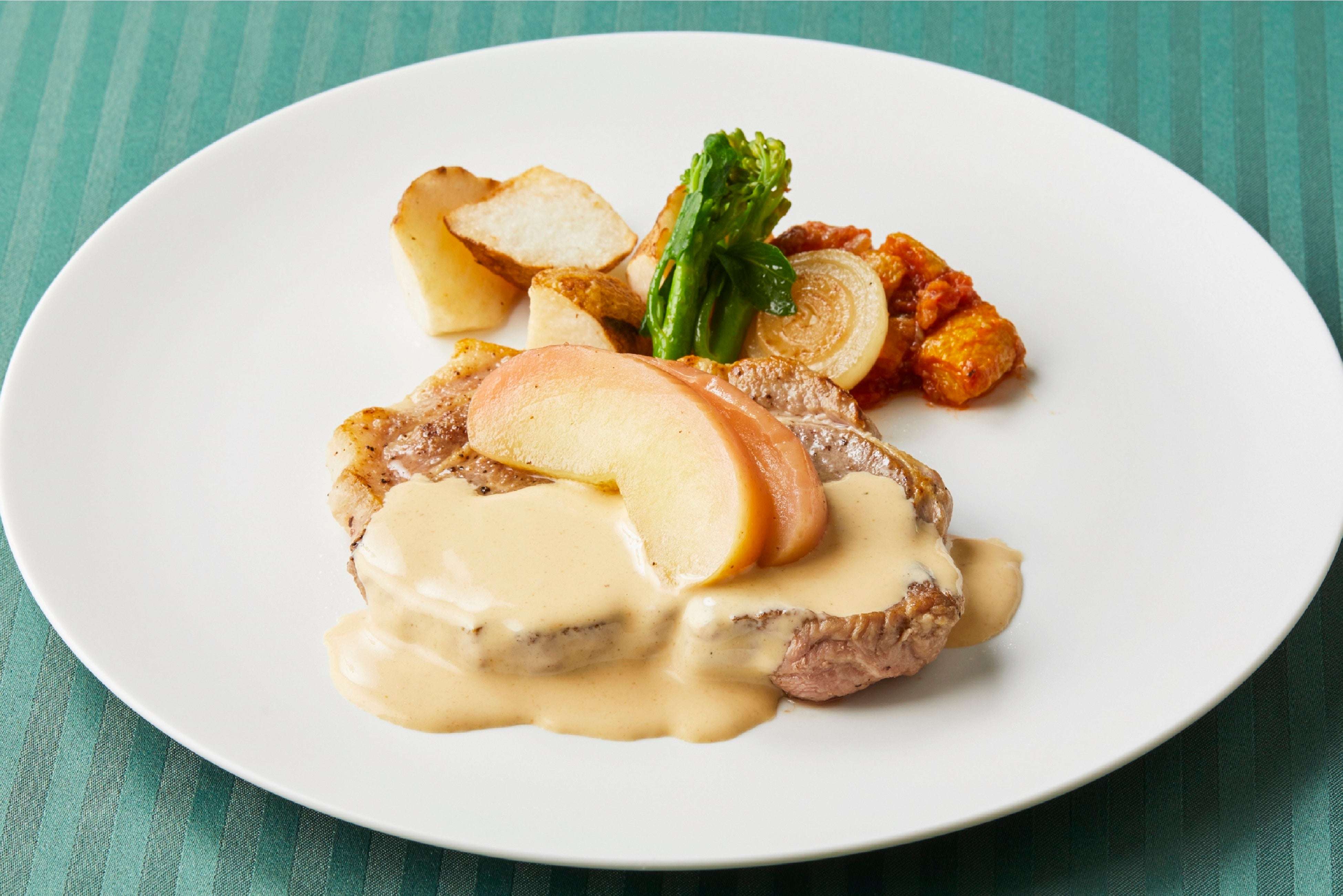 表面をカリッと焼き上げたガーリックポークに、リンゴの風味が香るノルマンディー風ソースを合わせた爽やかな一品です。