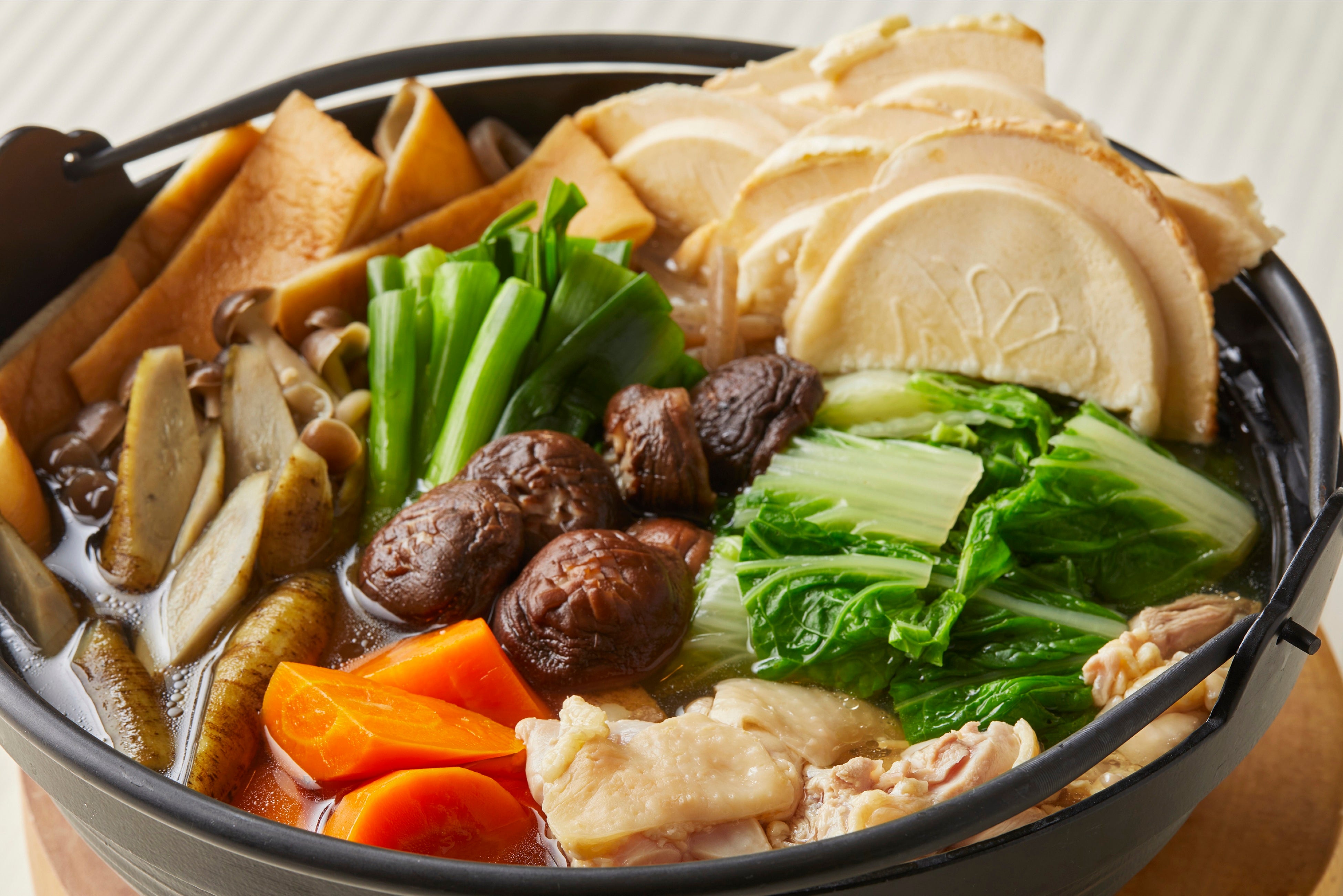 東北牧場で採れた旬の無農薬野菜をたくさん入れて煮た、やさしい味わいの鍋料理。野菜の甘みが引き立つつゆが染み込んだ煎餅の食感をお楽しみいただけます。