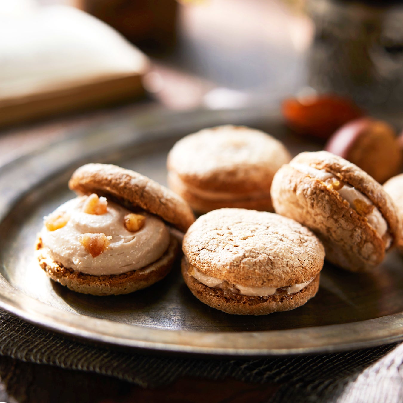 イタリア産栗のマロングラッセをメープルが香るホワイトチョコレートクリームとマロン風味のダックワーズ生地でサンドしました。クリームにはラム酒をほのかにきかせ奥深い味わいに。栗とメープルの絶妙なハーモニーをお楽しみください。