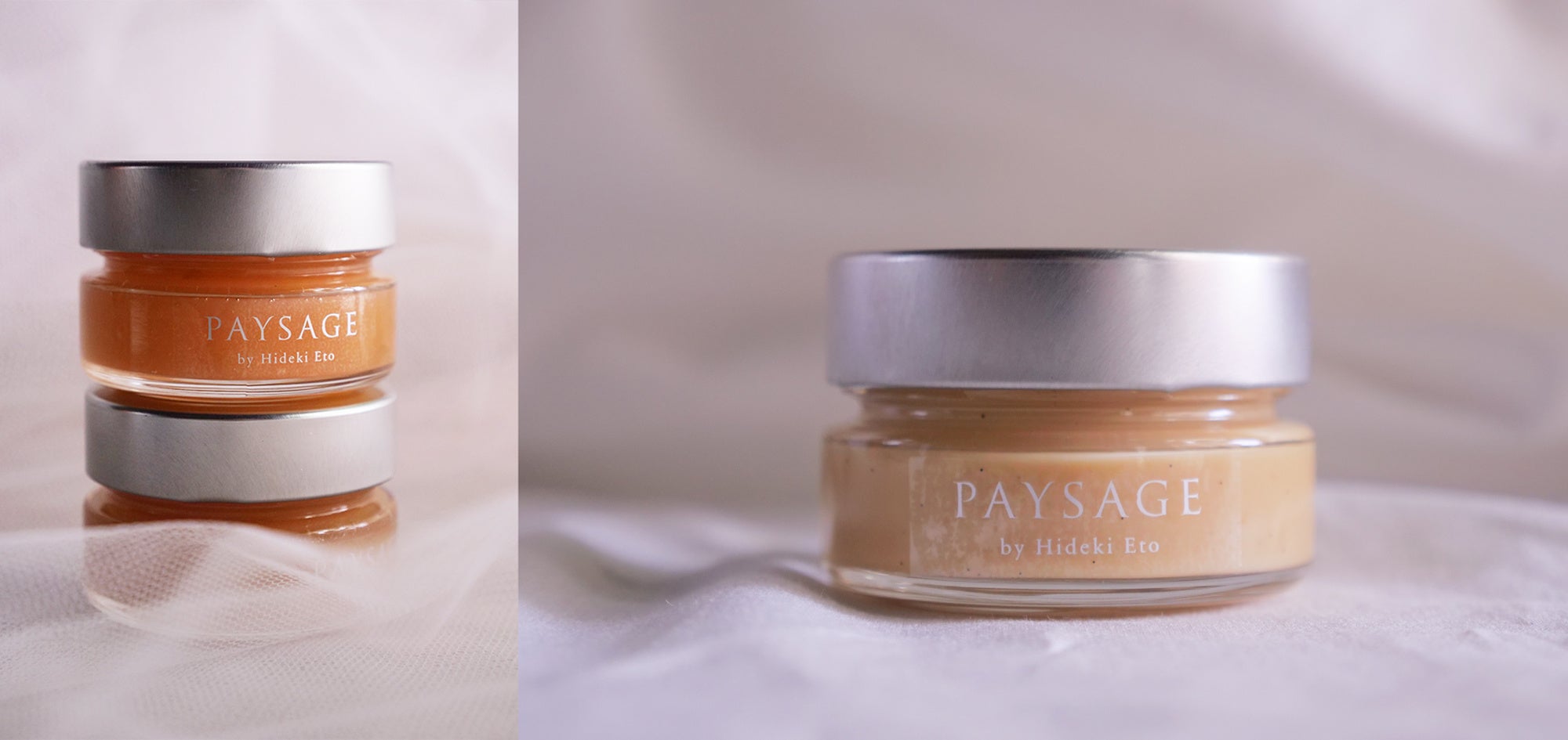 PAYSAGEオリジナルのブレンドティーを牛乳と一緒にコトコト煮詰めて仕上げたミルクティーのコンフィチュール(写真右)と、長野県・佐久穂町にある須田農園のシナノリップをまるごと使用した贅沢なコンフィチュール(写真左)の2種類をご用意しました。