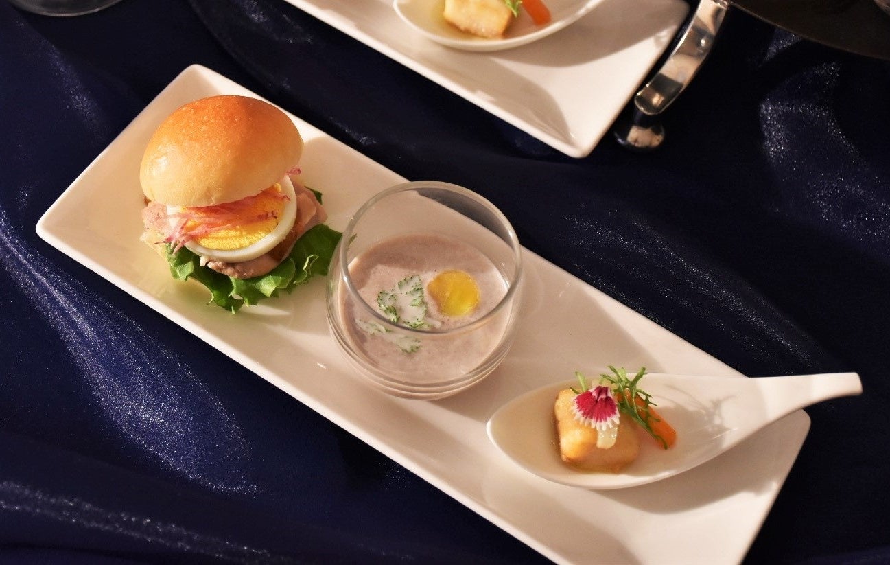 中秋の名月と呼ばれる「十五夜」、十五夜に次いで月が美しく見える日とされる「十三夜」と、9月10月は一年で最も月が綺麗に見える時期です。そんな秋の夜空に浮かぶ月をイメージした満月飾りのグラススイーツや、うさぎ姿の柚子とホワイトチョコレートのムースなどお月見をテーマにしたスイーツが登場。また、十五夜は「芋名月」、十三夜は「豆名月」、「栗名月」ともいわれていることにちなみ、栗や黒豆を使ったスイーツもお召しあがりいただけます。また、お月見には欠かせない団子をアレンジした季節の三色団子のほか、フルーツは月替わりで、梨(9月)、柿(10月)をご用意。別添えで、「ねぎ塩チキン月見バーガー」や満月が浮かんだようなビジュアルの「あずきのスープ」など、お月見を表現したセイボリーが並びます。