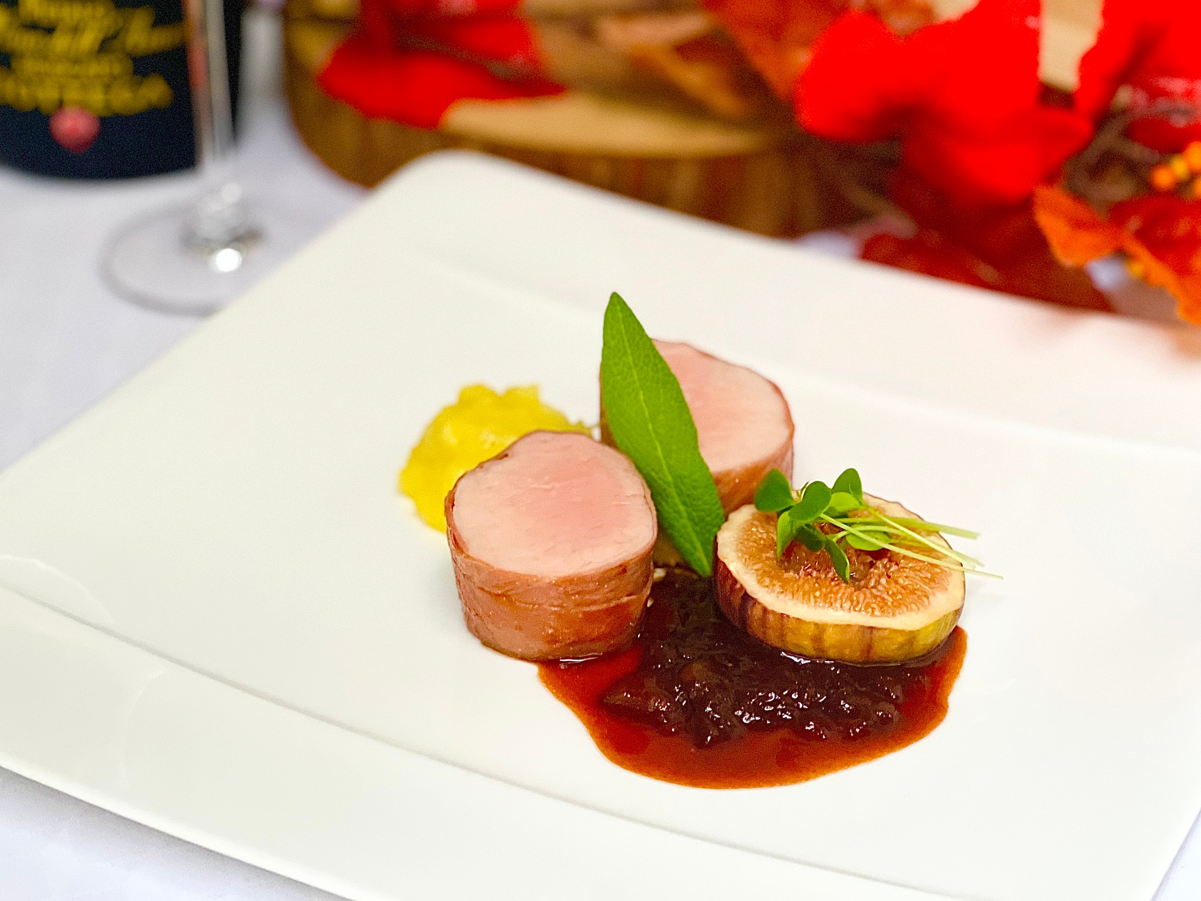 《ポークフィレ肉の生ハム巻きロースト、紅はるかのエクラゼ イチジクとバルサミコのソース》