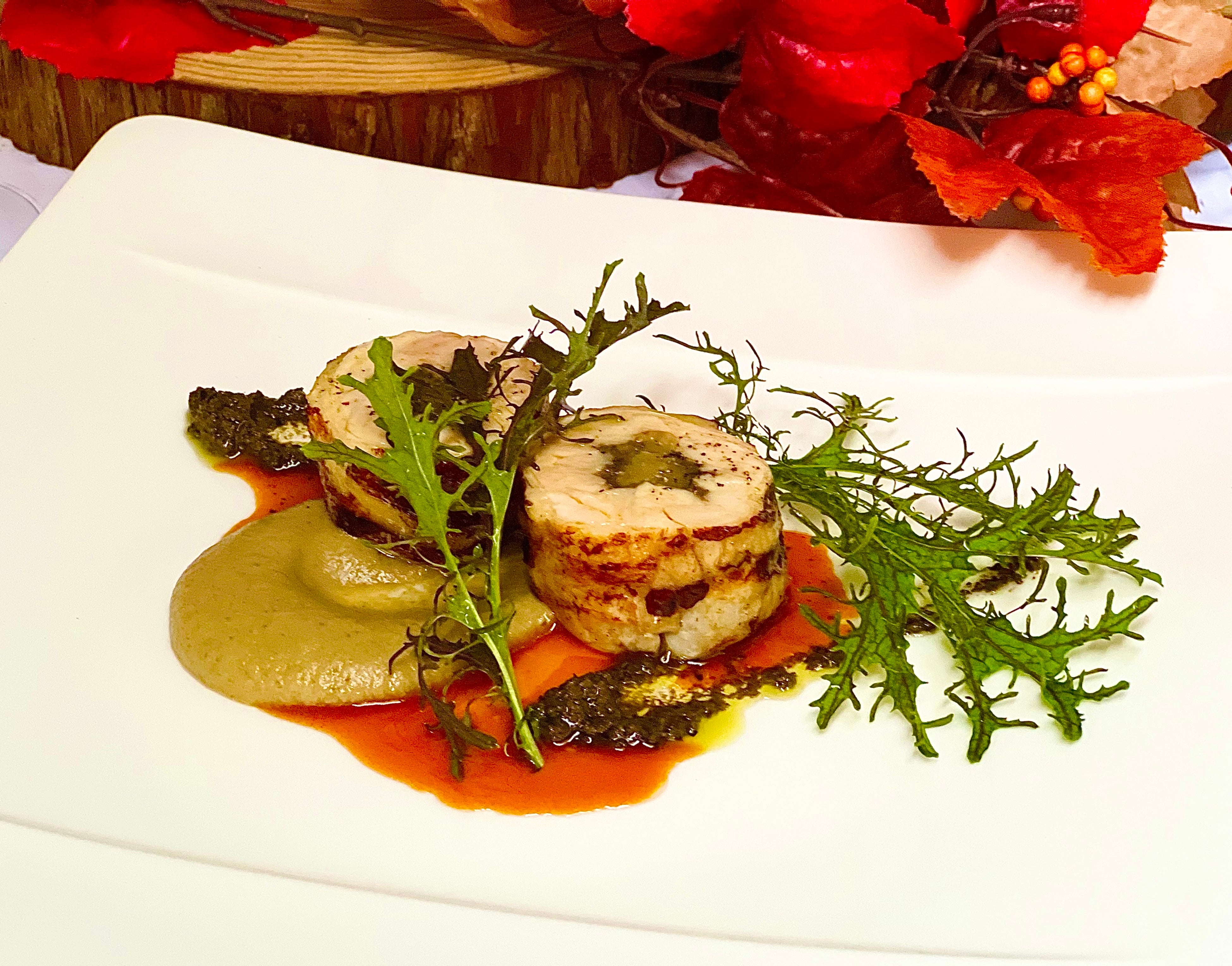 《錦爽鶏と千両茄子のガランティーヌ仕立てグリル タップナードソース》