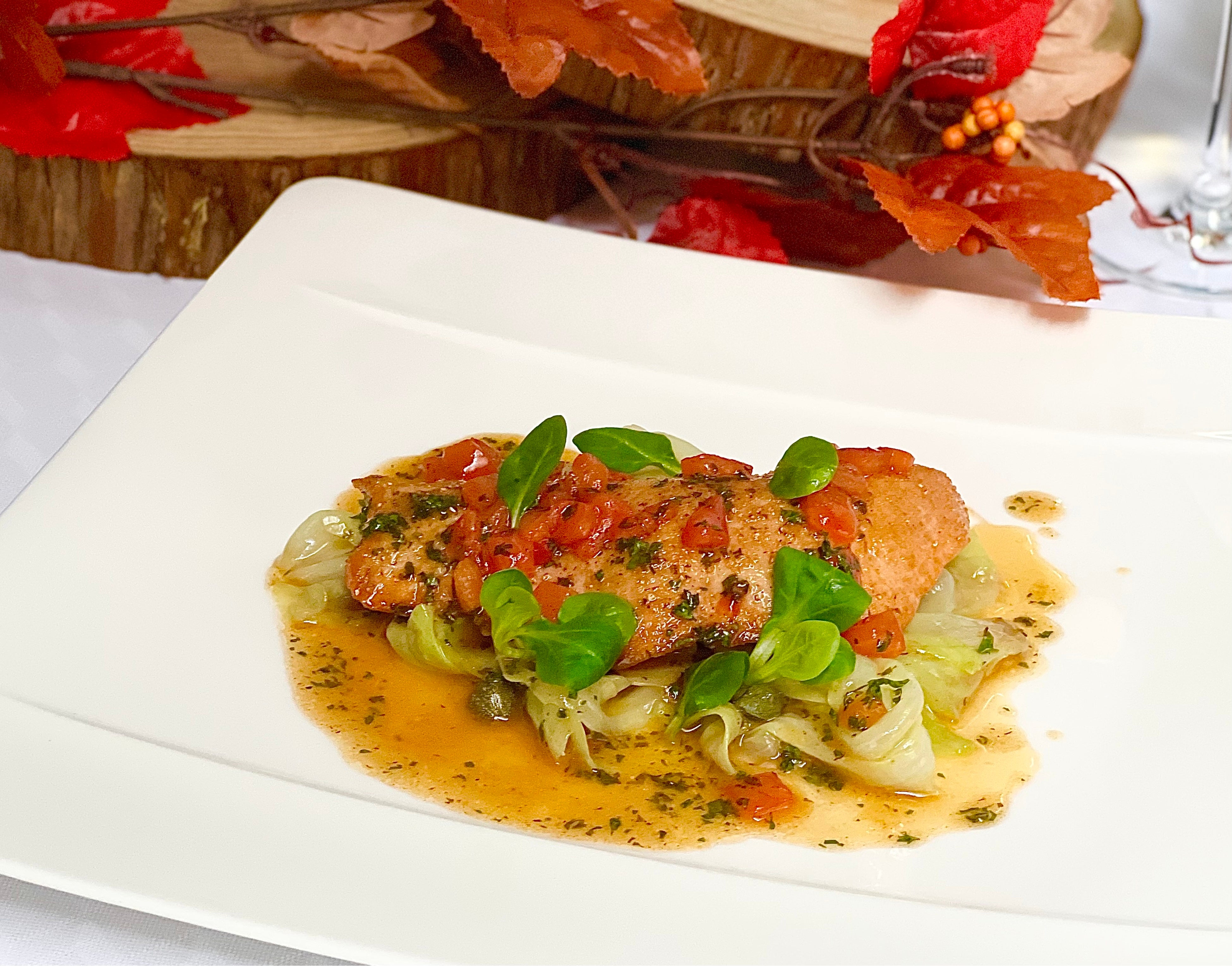 《秋鮭のムニエル、蒸し煮キャベツ添え 焦がしバターソース》