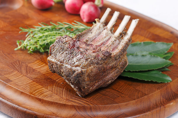 仔羊の骨付きロースのブロック肉を、余分な脂はカットして、焼き色を付け、ハーブと一緒に低温調理でじっくり焼き上げました。骨付きロースが4本ついているブロック肉を使用しています。ブロックになっているため、通常のカットだと外に漏れだしてしまう肉汁を閉じ込めてくれます。時間をかけて火を通したかたまり肉は、カットすると断面はきれいなロゼ色で、食感はやわらかくしっとりとジューシーな仕上がりです。