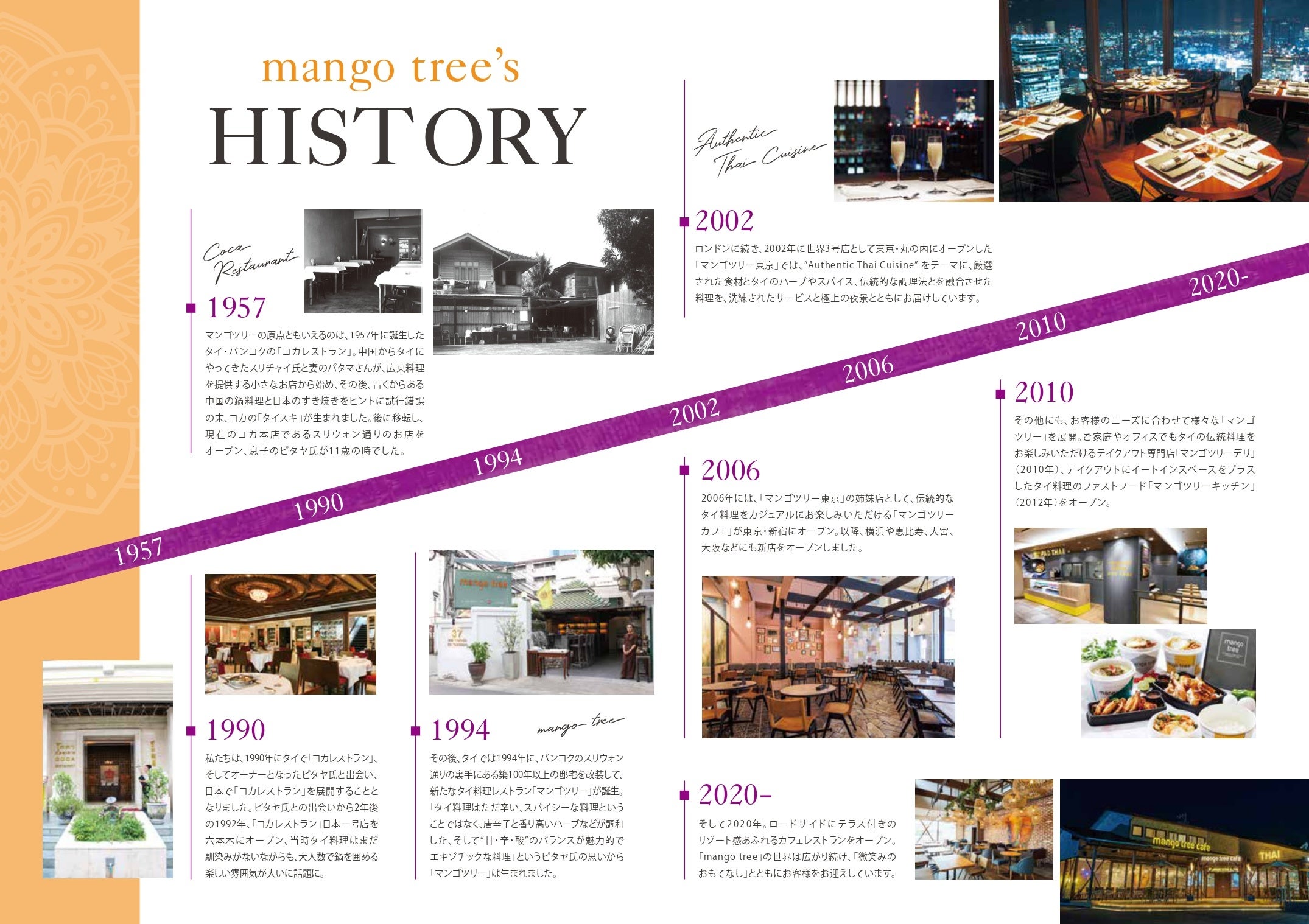 タイ・バンコクに1994 年に創業し、ロンドン、日本、ドバイ、香港と世界各国に展開するタイ料理レストラン「mango tree」。「マンゴツリー」は1994年、タイ・バンコクのスリウォン通りの裏手にある築100年以上の邸宅を改装して作られたタイ料理レストランで、ロンドンに続き2002年に世界3号店として東京店がオープンし、”Authentic Thai Cuisine”をテーマに、日本の厳選された食材とタイのハーブやスパイス、伝統的な調理法を融合した料理を、洗練された空間とサービスとともにお届けしています。「マンゴツリー東京」は、タイ国商務省の 審査で5つ星にあたると評価されたレストランに与えられる“THAI SELECT Signature”(タイ・セレクト・シグネチャー)を取得しています。