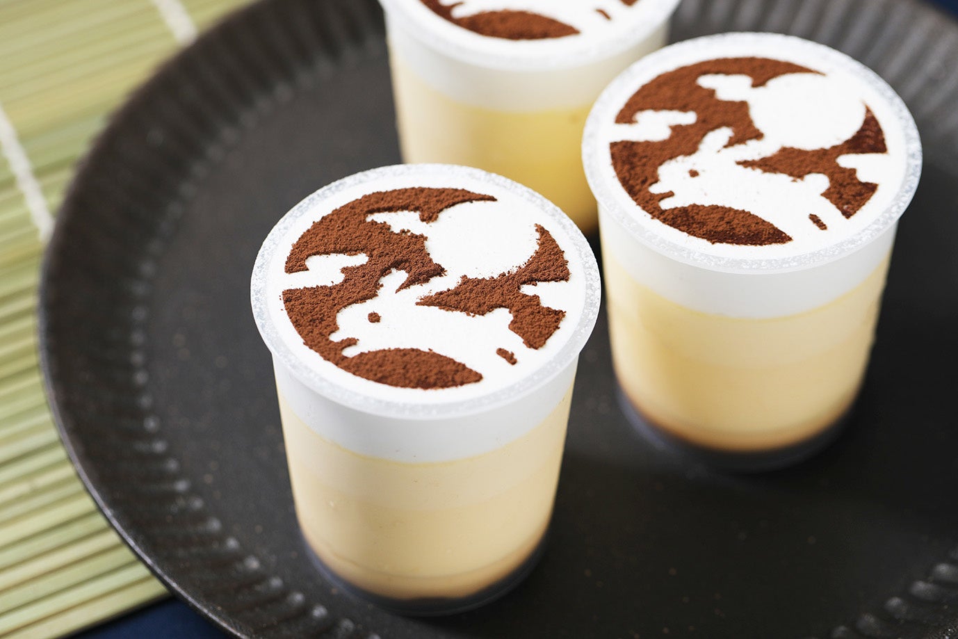 看板商品「なめらかプリン」にホイップクリームを重ねて、ココアパウダーでお月見うさぎのイラストを描きました。なめらかプリンのコクがあってミルキーな味わいと口の中でふんわりとろけるホイップクリームが絶妙な味わい。お月見にかけて販売される、10日間限定のイラストプリンをどうぞお楽しみください。