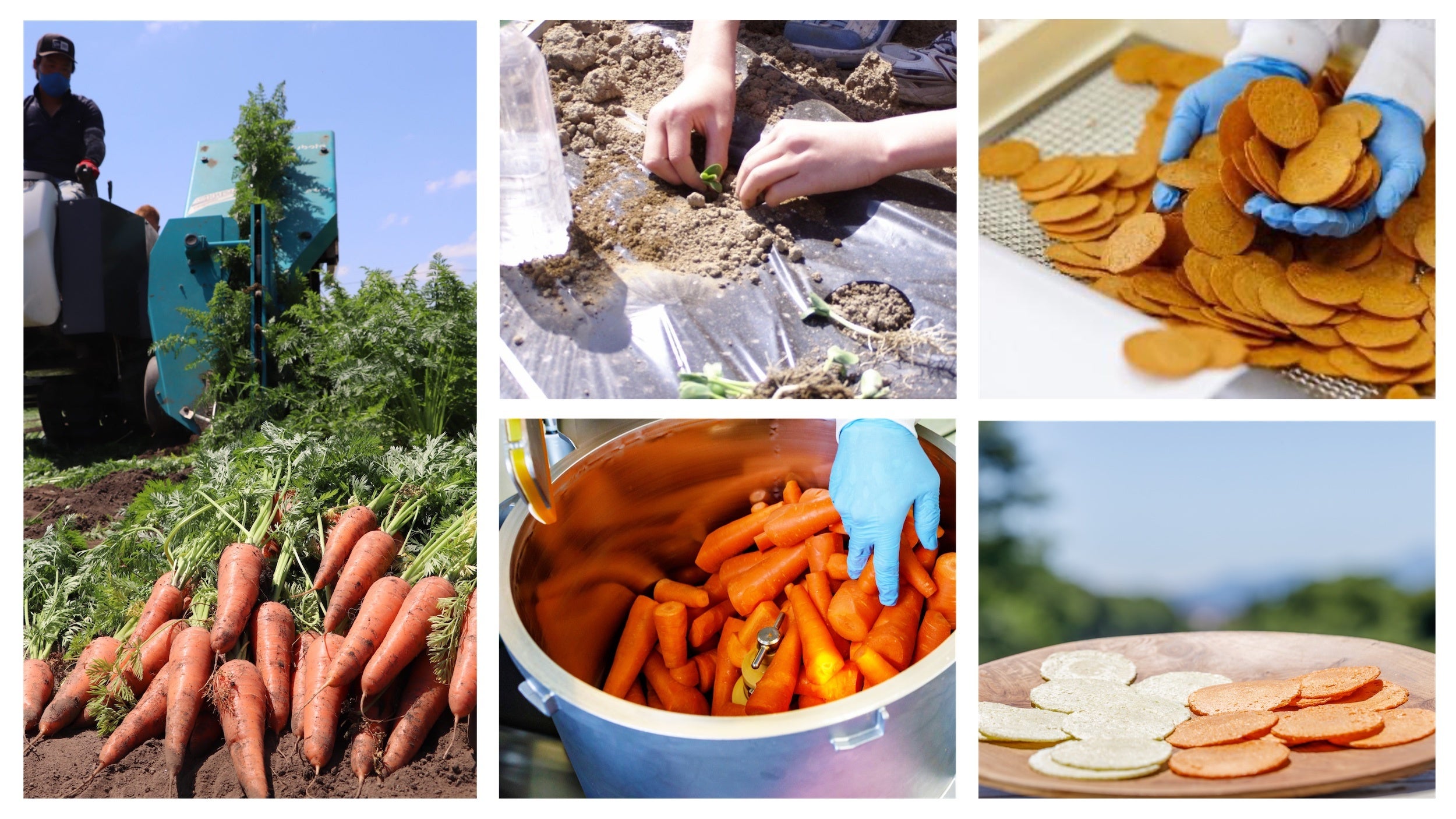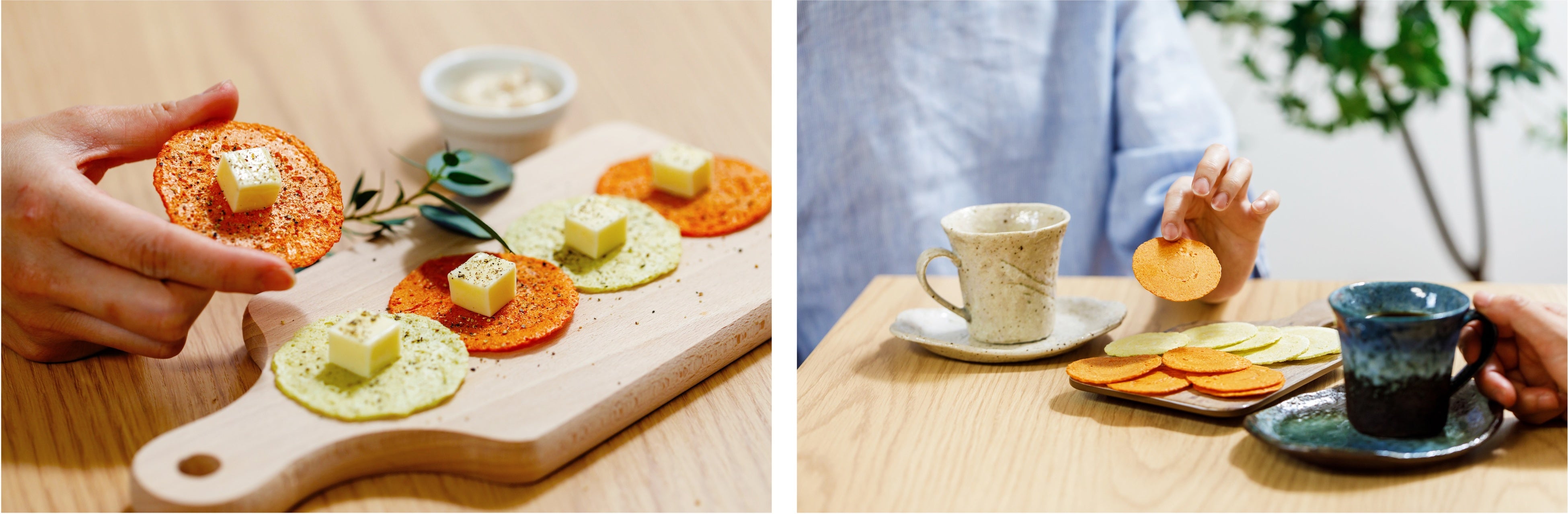 地元岐阜のフードロス削減に貢献したいと考え、捨てられるはずの曲がったり、小さい野菜などを丁寧に手洗いして、カット、ペースト加工まで自社で行ったものをシンプルな製法で焼き上げたエシカルフードです。