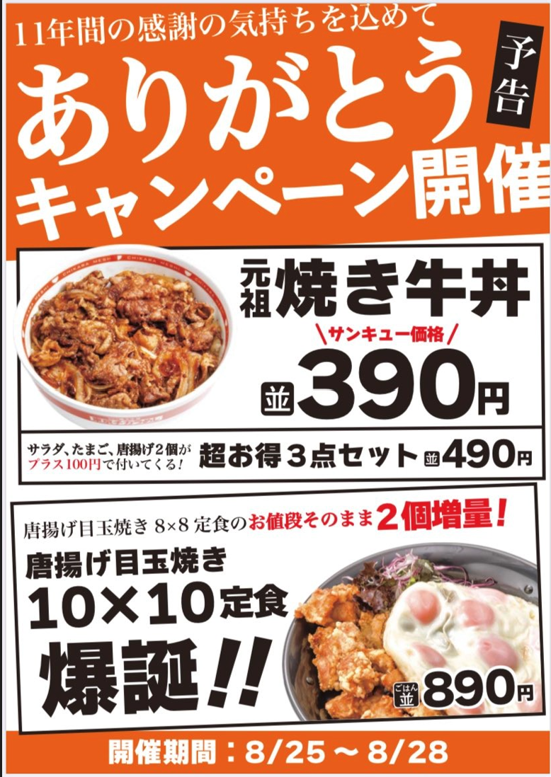 また、『焼き牛丼』に次ぐ人気商品『目玉焼き8×8定食』も期間中は『目玉焼き10×10定食』とパワーアップ!