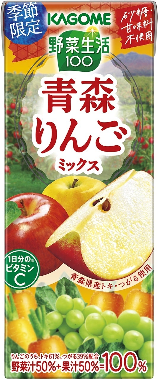 「野菜生活100青森りんごミックス」は、青森県産のトキ・つがるを使用した、りんごのさわやかな甘さとやさしい甘さを楽しめる野菜・果実100%ミックスジュースです。「トキ」は青森生まれの品種で、コクのあるさわやかな甘みが特長、「つがる」は青森県生まれ品種で、やさしい甘さが特長です。朝食のおともやリフレッシュしたいときにおすすめです。パッケージ背景には、りんご畑越しの岩木山をデザインしています。