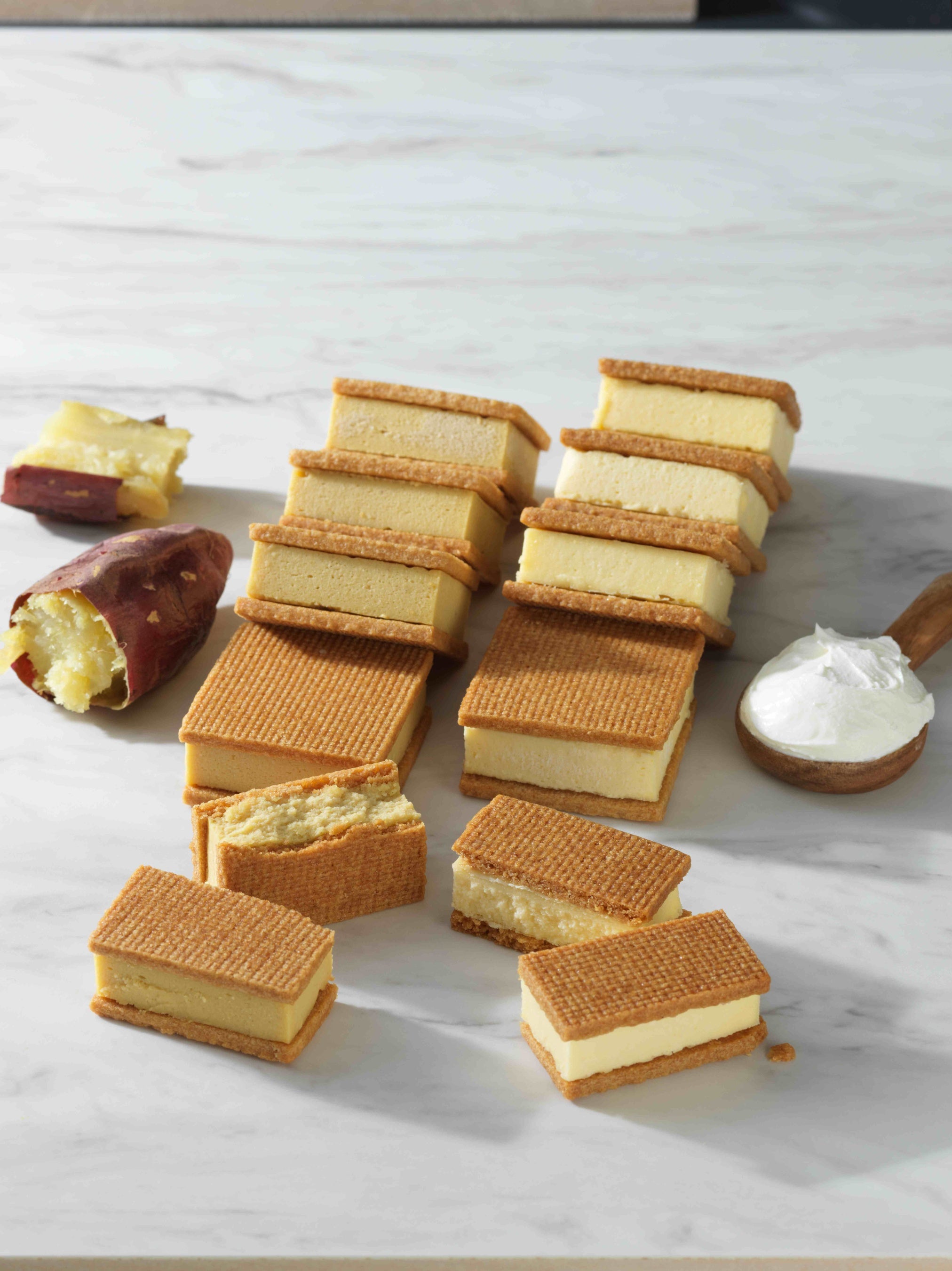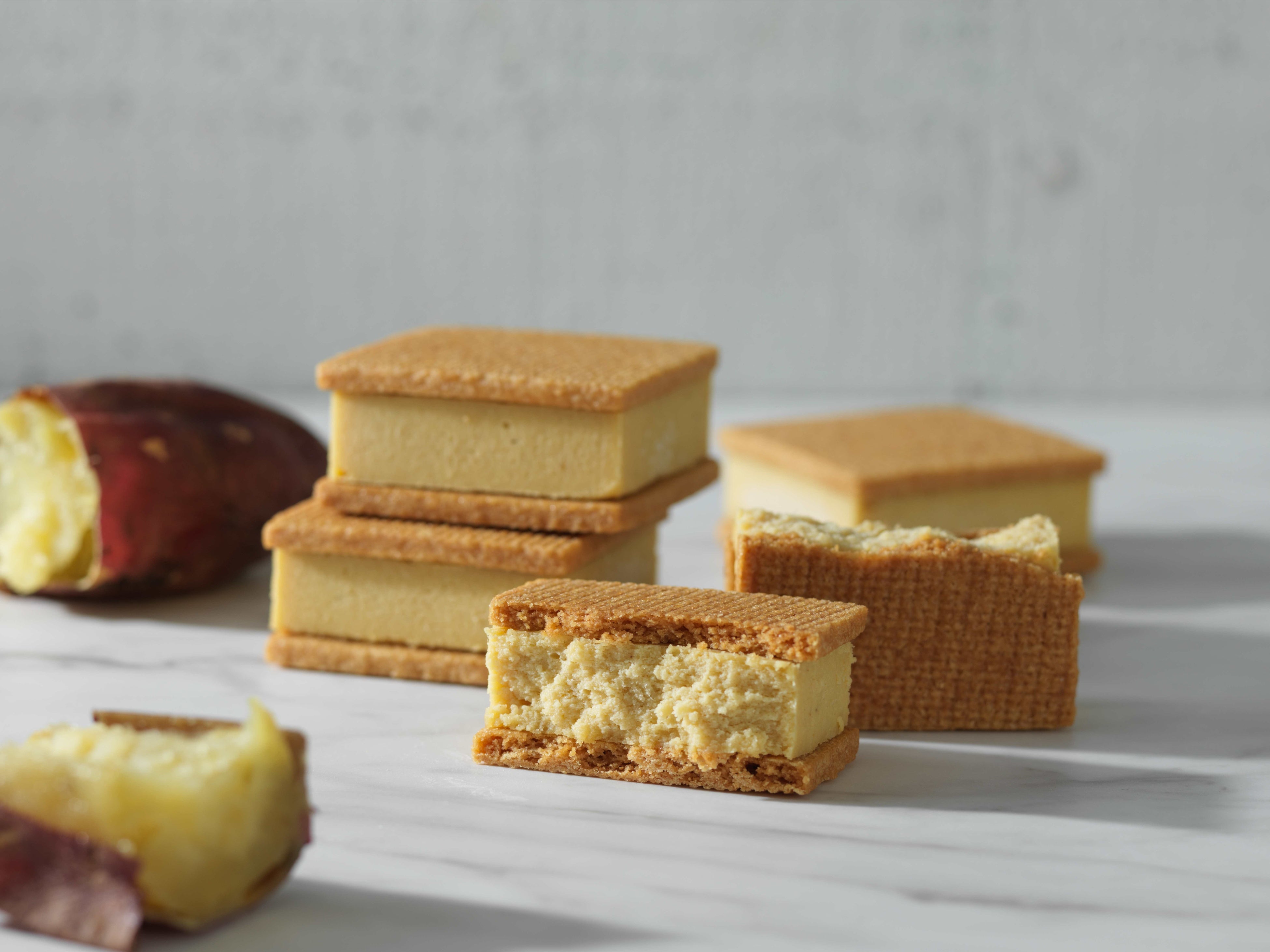 季節の限定味に「スイートポテト」が新登場です。クセの少ないオーストラリア産クリームチーズが安納芋の甘さを引き立てます。ほっこりとした味わいに仕上げたベイクドチーズケーキをしっとりとしたサブレでサンドしました。