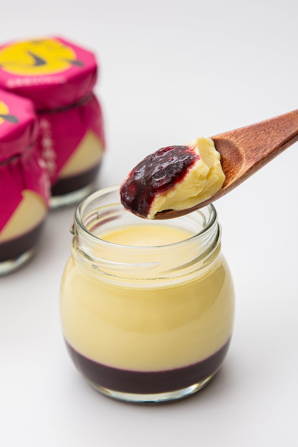 北海道下川町にある及川農園のハスカップは、大実ハスカップではなく野生種を育成しており、強い酸味とコクが特徴です。あべ養鶏場では、及川農園のハスカップに、甜菜糖を入れてハスカップソースで強い酸味に中に、爽やかな甘さが加わり、ぷりんとの相性が抜群になりました。