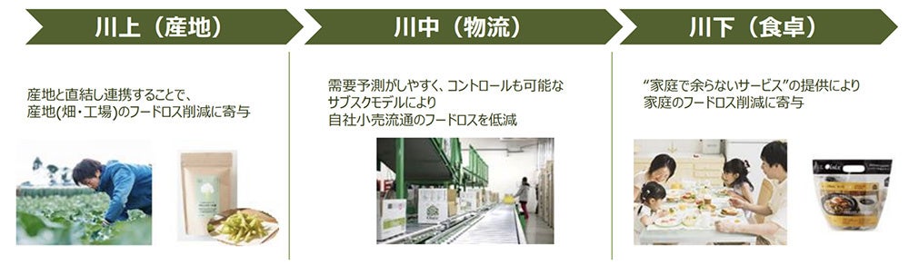 当社は、「サステナブルリテール」(持続可能型小売業)として、サブスクリプションモデルによる受注予測や、ふぞろい品の積極活用、家庭での食品廃棄が削減できるミールキットなどを通じ、畑から食卓まで、サプライチェーン全体でフードロスゼロを目指しています。