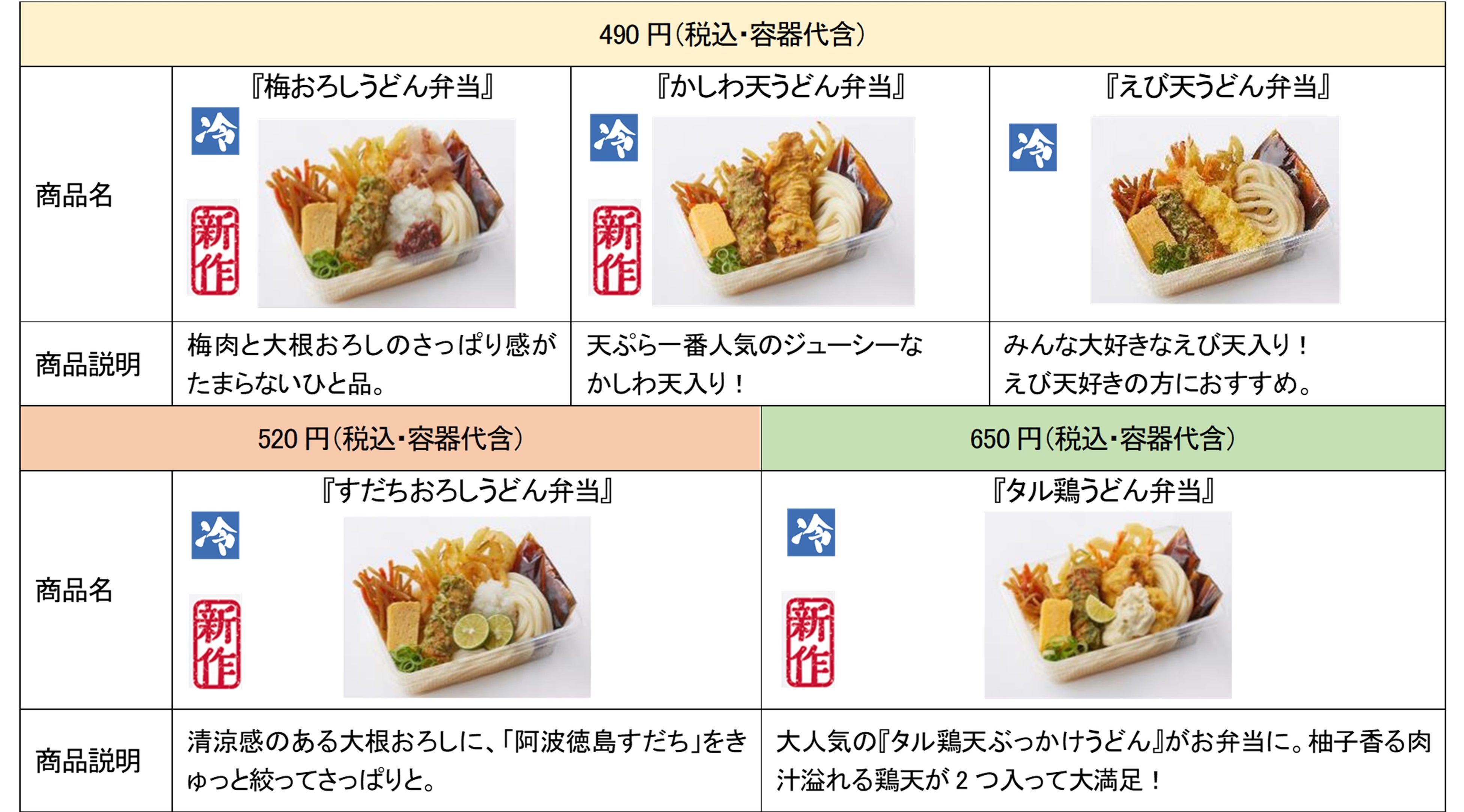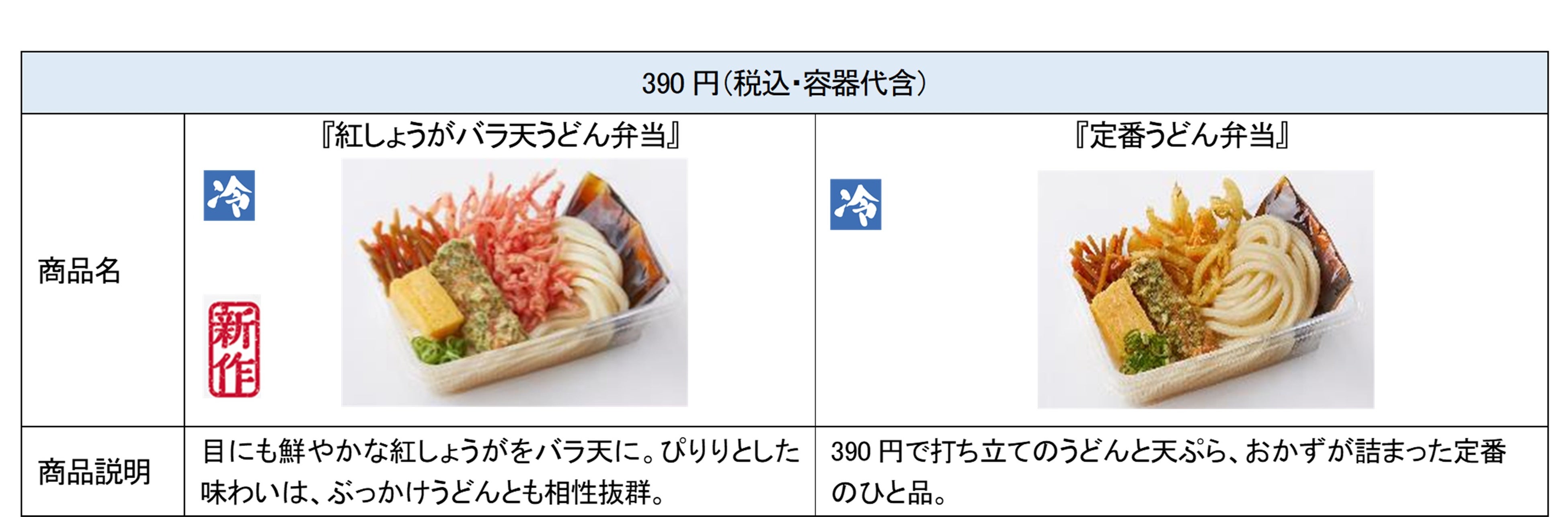 選べる楽しみとお手頃な価格で打ち立てうどんをご堪能いただきたいという想いから、390円のラインアップに新作『紅しょうがバラ天うどん弁当』が新登場。さらに、490円のラインアップには、さっぱりとした味わいの新作『梅おろしうどん弁当』、天ぷら人気No.1のジューシーなかしわ天入りの『かしわ天うどん弁当』が仲間入り。『定番うどん弁当』『えび天うどん弁当』と合わせると、お手頃価格な390円、490円ラインアップが全5種類になって、選べる楽しさが拡大しました。