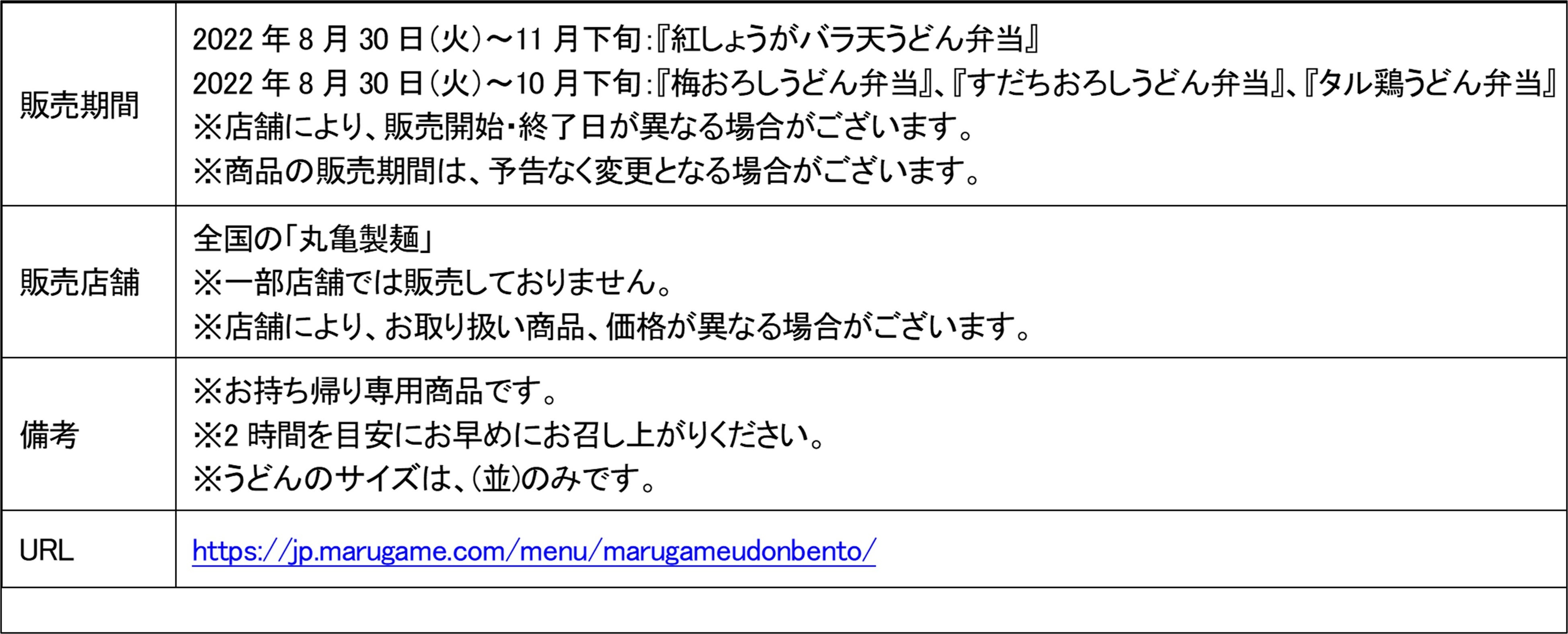 株式会社丸亀製麺(本社:東京都渋谷区、代表取締役社長:山口 寛)が展開する讃岐うどん専門店「丸亀製麺」は、お得な390円のラインアップに新作『紅しょうがバラ天うどん弁当』と、490円のラインアップに『梅おろしうどん弁当』、『かしわ天うどん弁当』を新たに加え、2022年8月30日(火)より期間限定で販売いたします。また、まだまだ暑さが残るこの時期にもぴったりな『すだちおろしうどん弁当』や、食べ応え十分な『タル鶏うどん弁当』と、好評販売中の『定番うどん弁当』、『えび天うどん弁当』を合わせて全7種類を展開いたします。ご自宅での食事はもちろん、これからの秋の行楽シーズンに、いつでも、どこでも、手軽に楽しめる打ち立ての「丸亀うどん弁当」をご堪能ください。