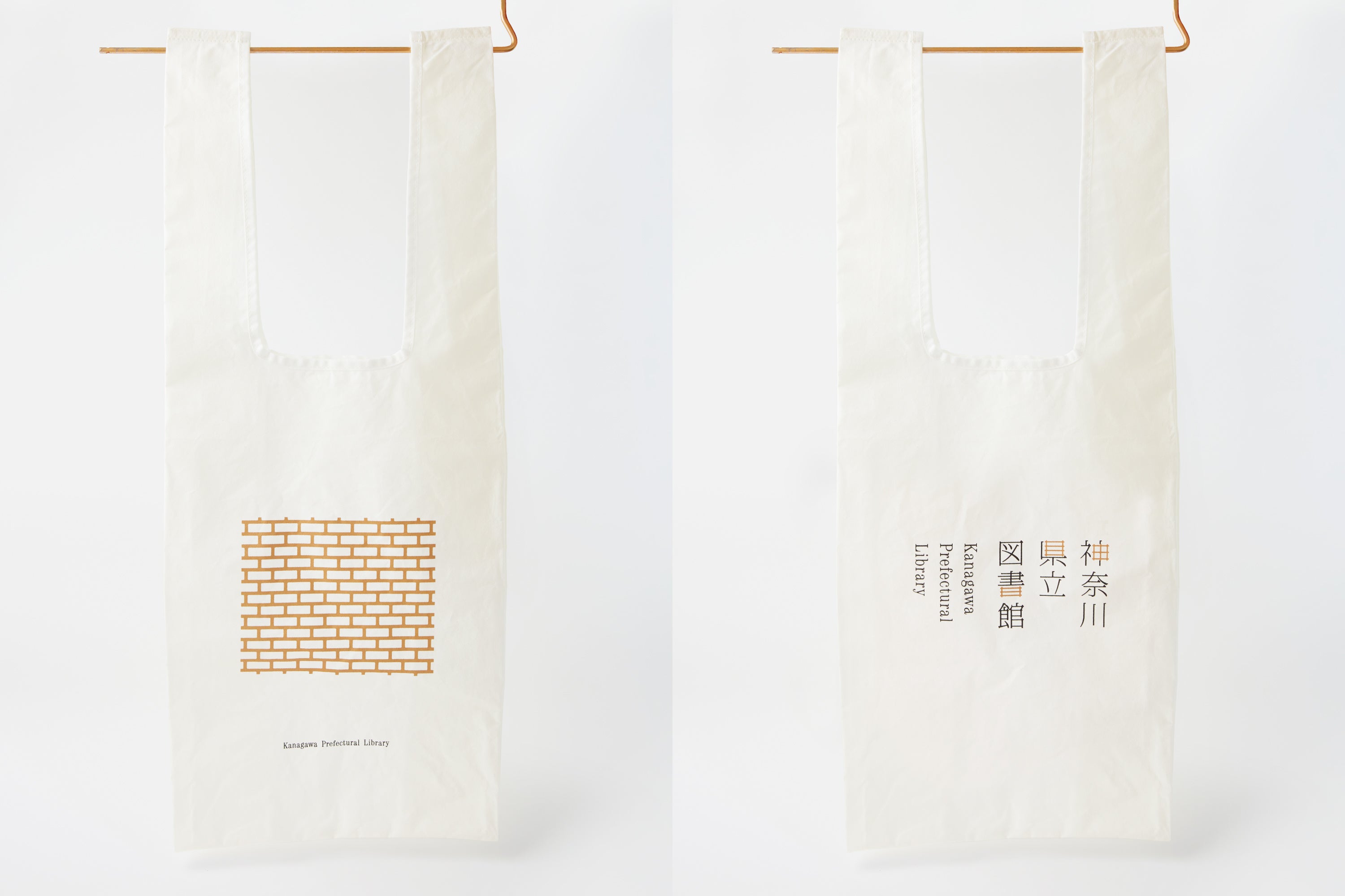 白を基調とし、神奈川県立図書館のロゴや、旧本館のシンボルである有孔煉瓦(ホローブリック)をモチーフにしたデザインが特徴です。またショッピングバッグは生地に和紙素材を使用しており、そのシワの風合いや手触りもお楽しみいただけます。