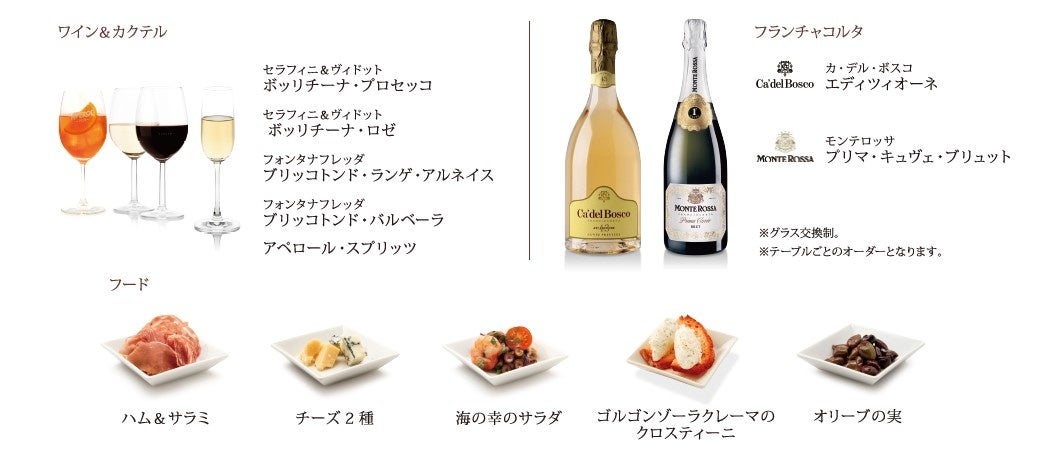 フランチャコルタも楽しめるフリーフロー付きセットメニュー。様々な食とのアッビナメントをお楽しみいただけます。