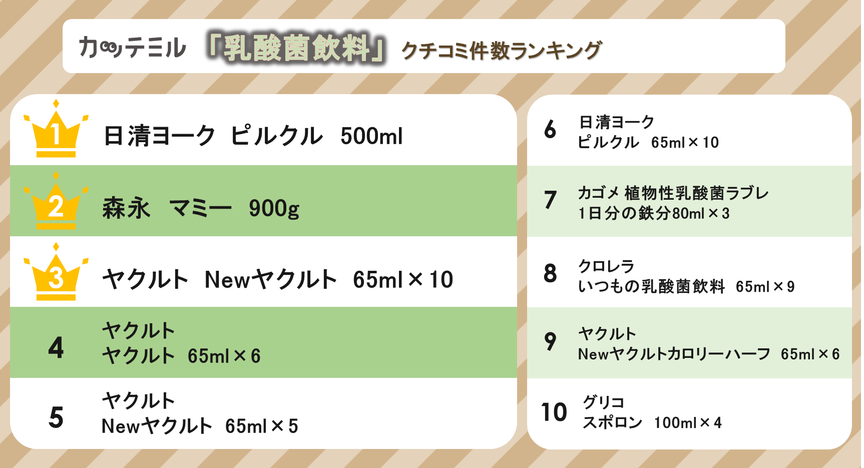 続いて、「乳酸菌飲料」カテゴリに焦点を当ててみました。4年5カ月の間で最もクチコミ件数が多かったものは、日清ヨークの「ピルクル」が1位となりました。「ピルクル」の人気の秘密をカッテミル内のクチコミを調査したところ「ヤクルトよりも安いので買っている」といった声が相次いでいました。そして2位にランクインしたのは森永の「マミー」。「ヤクルト」は3位という結果となりました。また7位にカゴメの「ラブレ」、8位にはクロレラの「いつもの乳酸菌飲料」など、乳酸菌飲料もバラエティに富んださまざまな種類が発売され、大人から子どもまで幅広く支持を受けています。