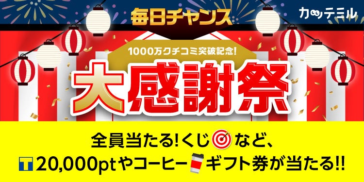 「カッテミル」をご利用いただいているユーザーの皆さまへの感謝の気持ちを込め、Tポイントが毎日全員に当たるくじやルーレット、またクチコミを初めて投稿いただくと、抽選でTポイントが最大1万ポイント当たるなどの「1000万クチコミ突破記念!大感謝祭」キャンペーンを開催いたします。キャンペーンの詳細はキャンペーンサイト(https://web.tsite.jp/cpn/km/10million_reviews/)をご覧ください。