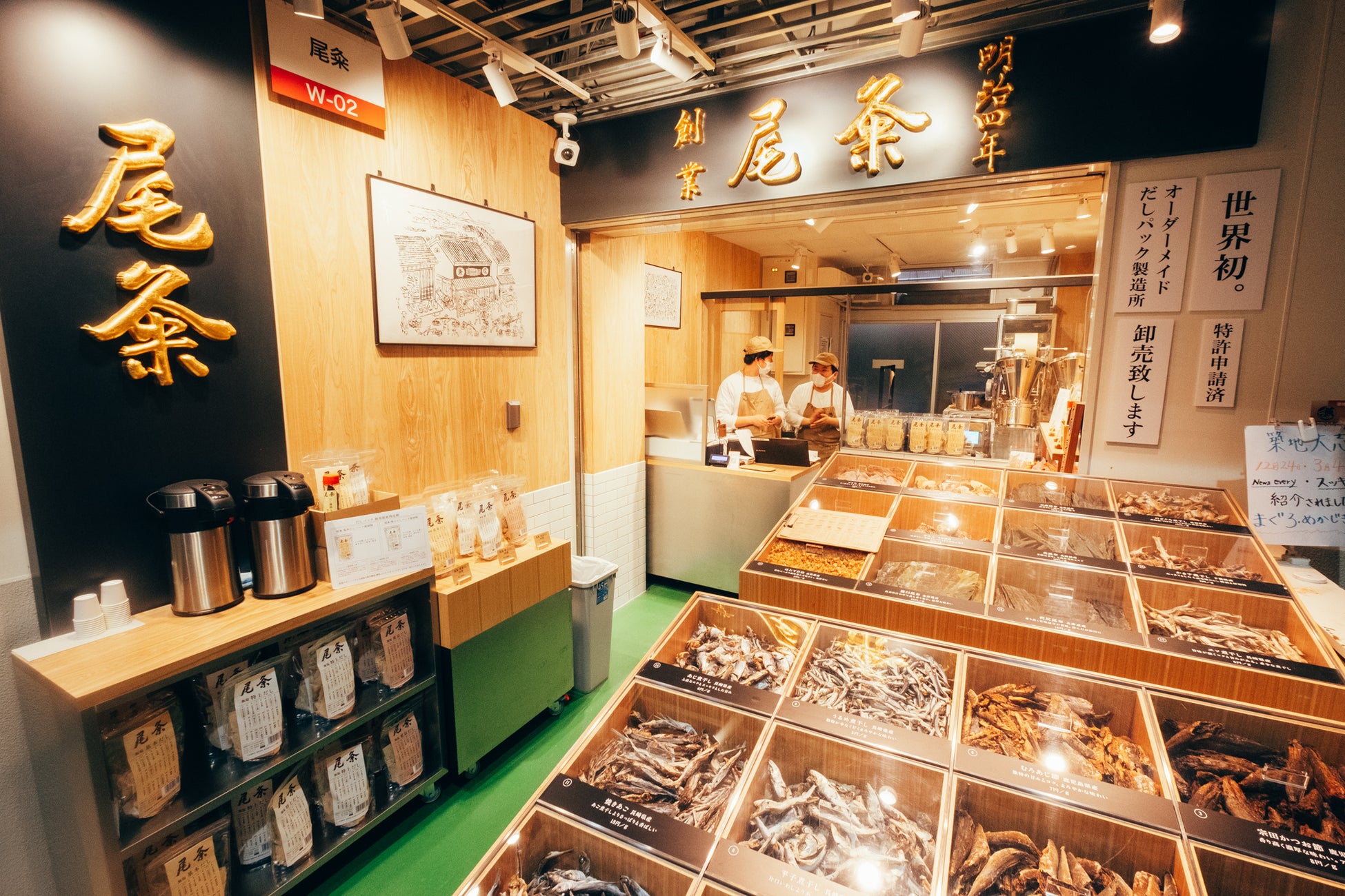 東京都中央区の築地魚河岸内にある「だし尾粂 築地製造所」では、オーダーメイドだしパックや既製品の各種だしパック、だし醤油の素の販売を行う。