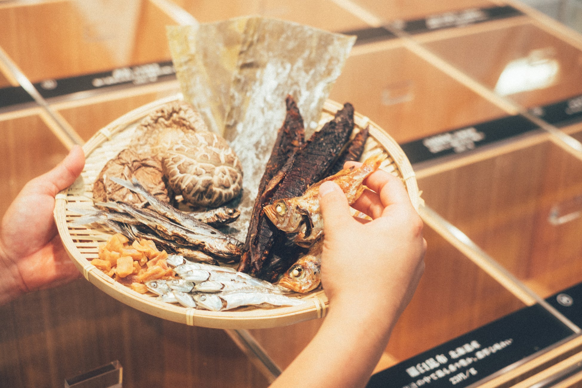 すべての原料素材がショーケースに陳列されており、だしソムリエの資格を持ったスタッフに相談しながら原料をセレクトし、オーダーメイドだしパックを作ることができる。