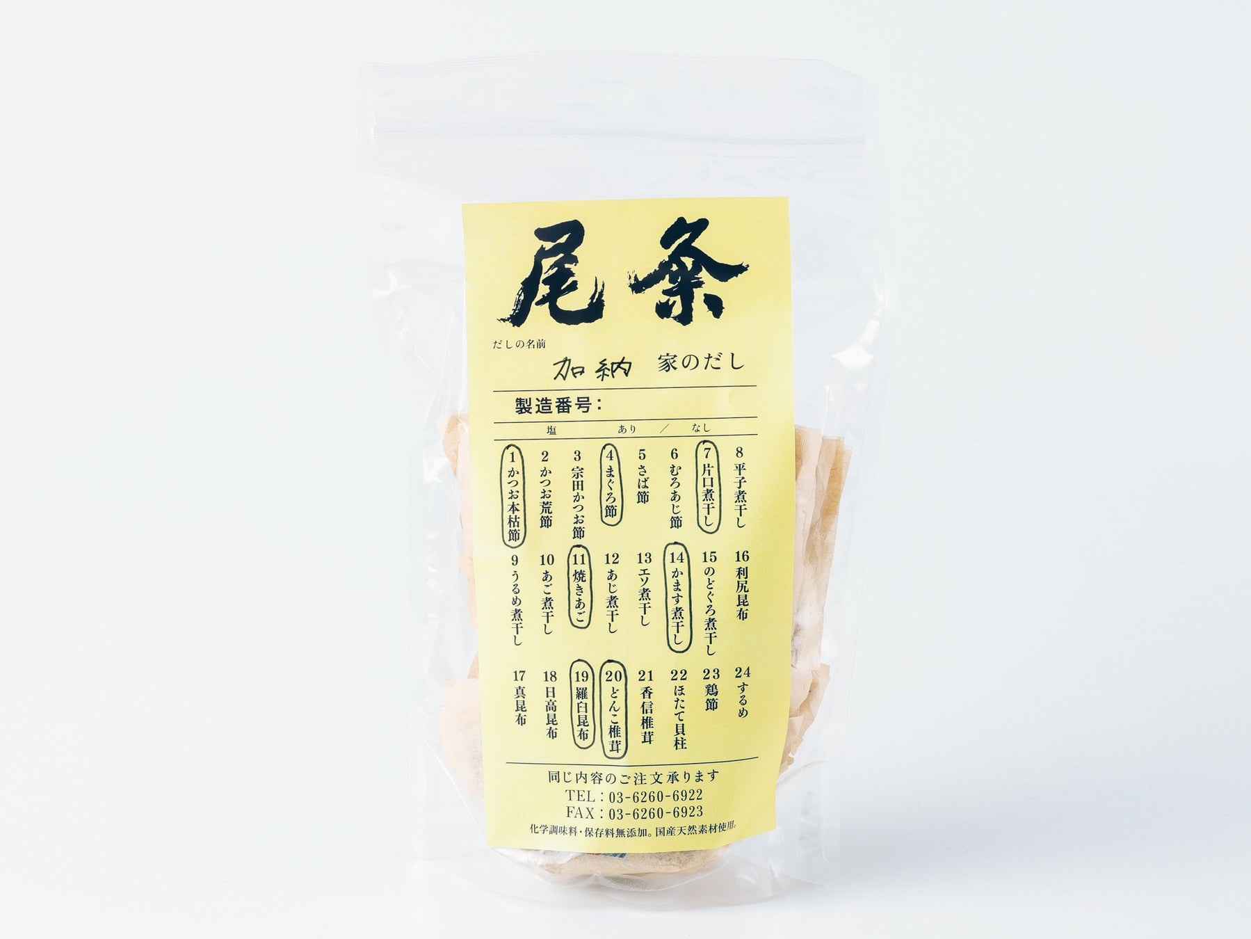 明治四年(1871)創業の豊洲市場水産仲卸「尾粂」が開発した”世界にひとつだけのだしパックを作られる”サービス。150年以上乾物を目利きしてきた知見を活かし、揃えた24種類の国産天然原料から複数種類を選べば、オリジナルのだしパックを作ることができる。