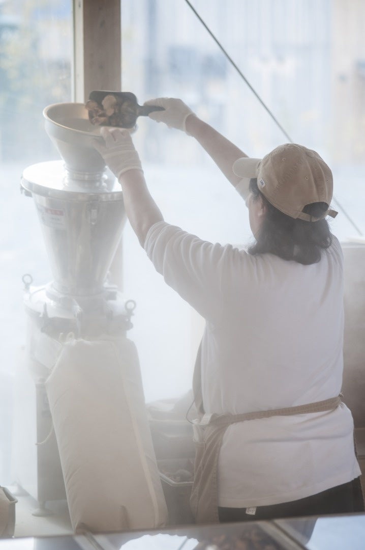 店舗内に加工場も備えており、原料のセレクトを終えると目の前で「配合→粉砕→充填→包装」が行われ、商品が出来上がるまでのすべての製造工程を見ることができる。