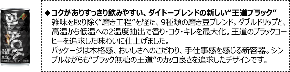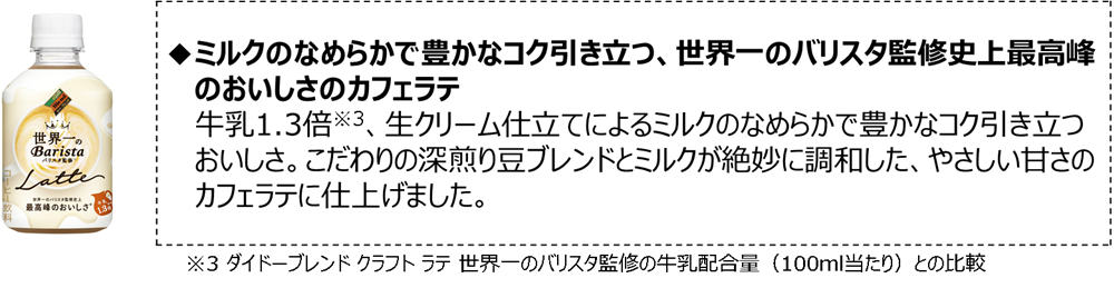 そこで今回、コーヒーの多種多様な美味しさを追求し続ける「ダイドーブレンド」ブランドより、様々なニーズに対応すべく、王道のブラックコーヒーを追求した「ダイドーブレンド ブラック」、世界一のバリスタ※²が監修し、こだわりのおいしさを貫く「ダイドーブレンド 世界一のバリスタ監修」シリーズより、上品なコーヒーにミルクの味わいが楽しめる「ダイドーブレンド ラテ 世界一のバリスタ監修」を新発売。嗜好性の高いコーヒー市場の更なる活性化を図ってまいります。