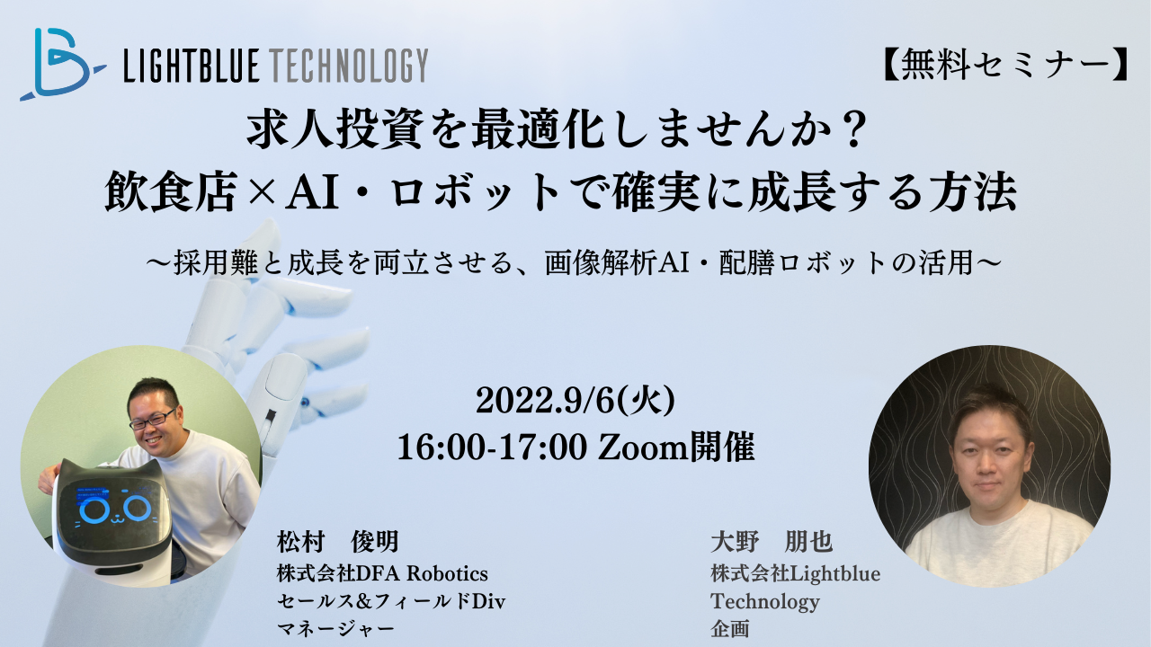 株式会社DFA Robotics(本社:東京都渋谷区、代表取締役:波多野 昌昭)は、9月6日(火)16時より、株式会社Lightblue Technologyとともに、【採用難と成長を両立させる、画像解析AI・配膳ロボットの活用方法】をテーマとしたウェビナーを無料にて開催いたします。