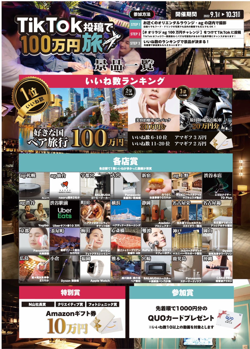 株式会社クラウドエヌ(所在地:東京都渋谷区、代表取締役社長:西山喜洋 )が展開する『オリエンタルラウンジ』『ag』全店舗にてTikTokを用いたイベントを9月1日〜10月31日で開催。最もいいねがついた動画の投稿者には「お好きなところへ行ける100万円分のペア旅行」を贈答するなど、豪華景品をラインナップ。全てのお客様に景品GETのチャンスがあるので、是非奮ってご参加ください。