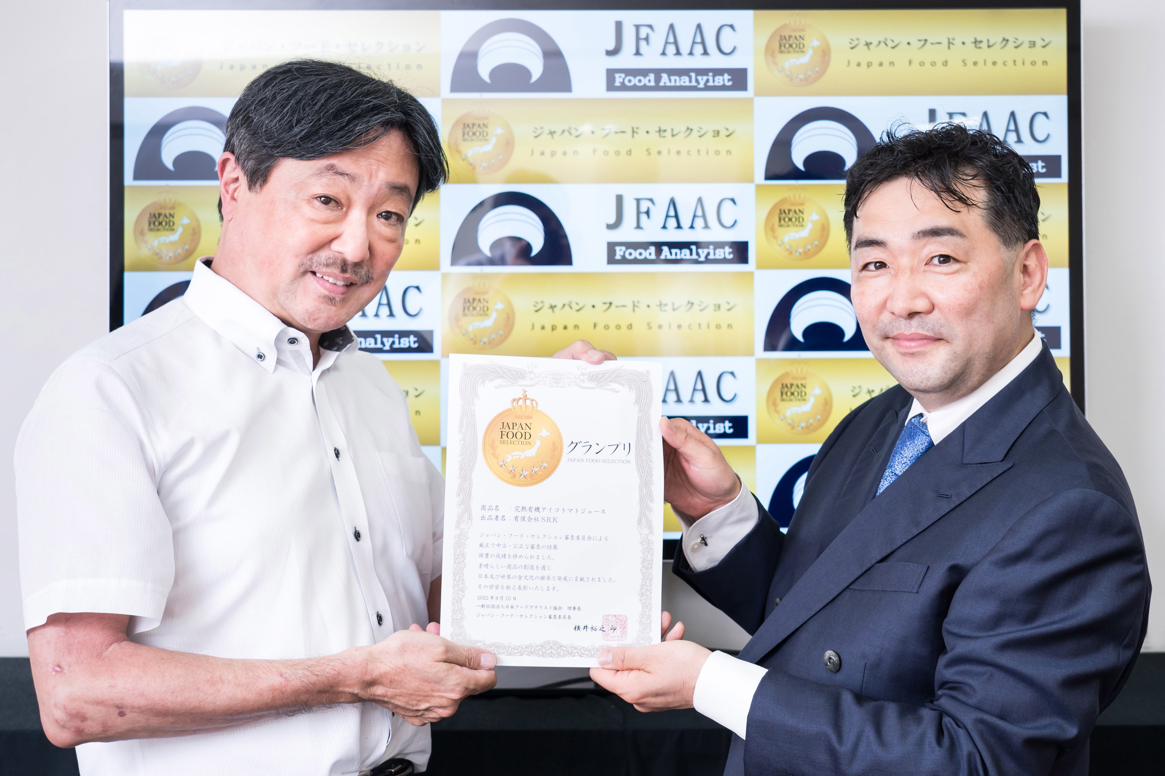 この度のグランプリ選出について、ジャパン・フード・セレクションの多くの審査員が 「無添加で、素材そのものの自然の甘みを感じられる美味しさを高く評価しています。また、自社農場にて有機農法で土壌作りから取り組んでいる姿勢は 『生産者が見える』 商品の信頼感のベースとなっており、安心して飲めるジュースとしてとらえられていると思います。ワインボトルのようなパッケージデザインも高級感があり、他社との差別化ができており、購買意欲をそそります。(中略) 今まで飲んだトマトジュースの味は一体なんだったのか?と思わせる商品クオリティーには脱帽です」 と評価しています。