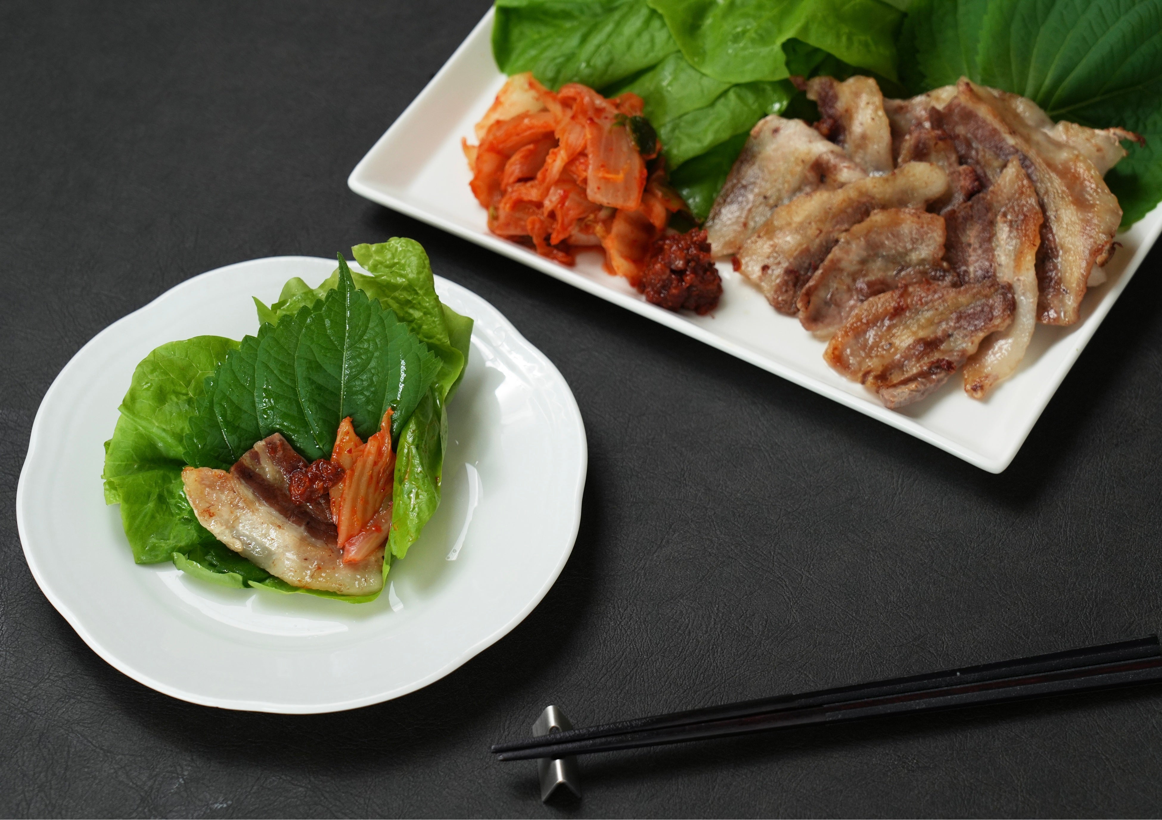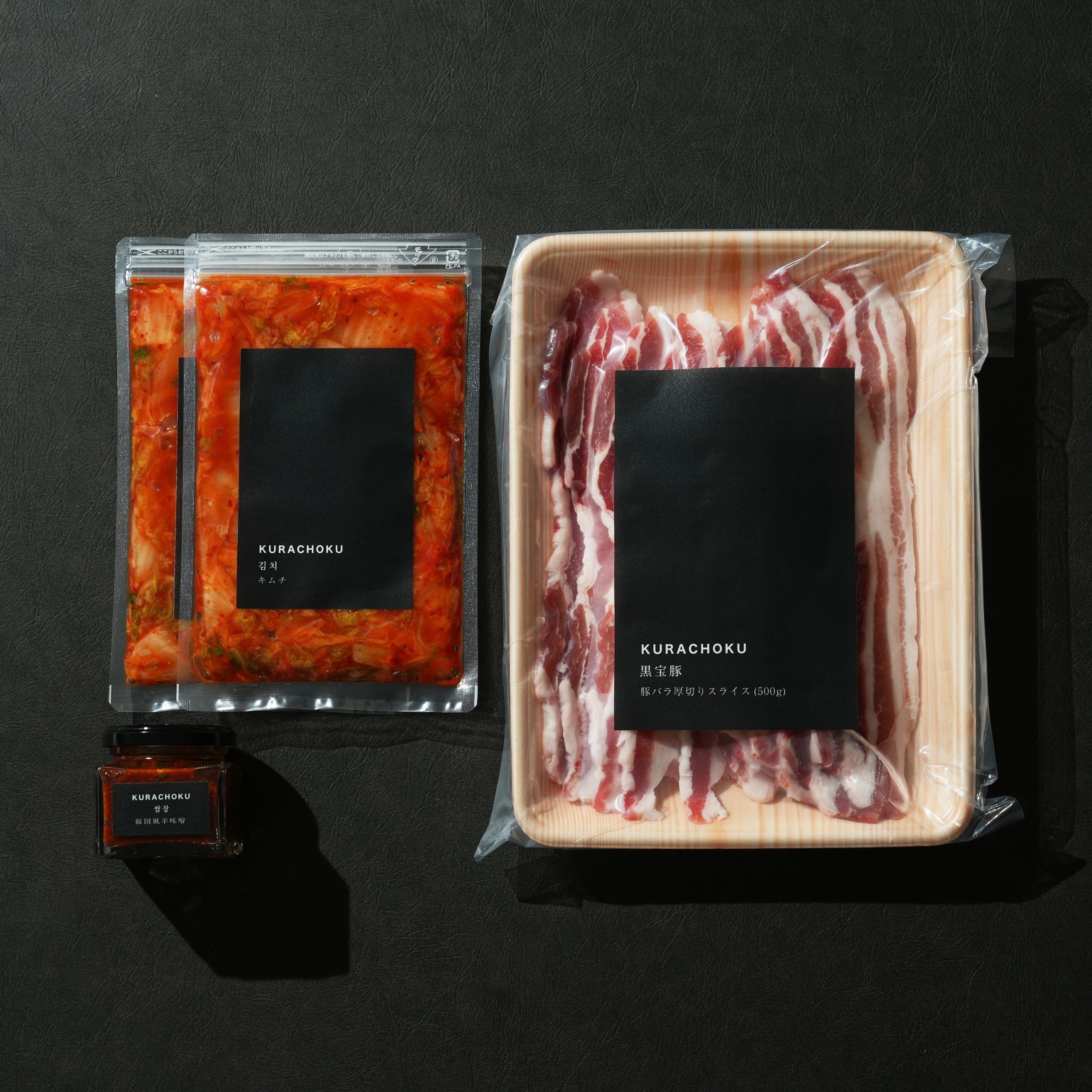 400年の歴史を持つ薩摩の黒豚を、酒造りにこだわる西酒造ならではの芋焼酎のもろみ粕で育て上げた、西酒造のオリジナルブランド豚「黒宝豚」。「芋焼酎のもろみ」はお芋とお米を麹菌と酵母菌で発酵させたものです。蒸留し残ったもろみには、アミノ酸やミネラル、食物繊維などの栄養分が多く含まれているため、黒豚にとって健康的なごちそうです。さらにもろみに微量に残ったアルコール分より、黒豚のストレスを取り除くことが出来るため、ぐっすりと良く寝た黒宝豚が育ちます。歯切れがよく柔らかい肉質は、「まろやかな甘み」と「濃厚な旨み」が際立ちます。黒宝豚は先人達の積み上げた工夫と弊社が独自に生み出した革新により、自信をもってお届けいたします。今回、西酒造のこだわりがつまった黒宝豚のサムギョプサルセットをご用意いたしました。セットには、西酒造特製の韓国辛味噌サムジャンと佐賀県産のキムチをお付けいたします。「蔵直CLUB」でしか味わえないサムギョプサルをご家庭でお楽しみください。