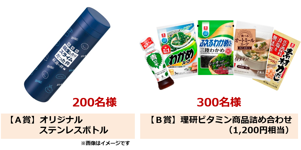 期間中にご購入いただいた理研ビタミン商品1点以上を含むレシート1枚を1口として、店頭設置の専用応募ハガキもしくは市販の郵便ハガキ、またはキャンペーン特設サイトの応募フォームにてご応募いただくと、抽選で合計500名様に「オリジナルステンレスボトル」または「理研ビタミン商品詰め合わせ」をプレゼントいたします。