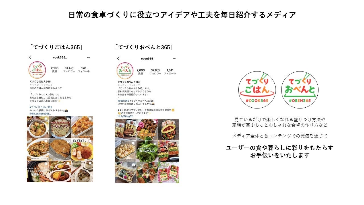 本パッケージでは、60万以上のフォロワーを有する「てづくりごはん365」、30万以上のフォロワーを有する「てづくりおべんと365」が企業Instagramアカウントとコラボレーションする形でユーザー参加型のキャンペーンを展開します。