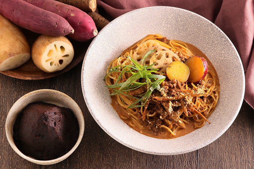 根菜の食感が楽しい八丁味噌のボロネーゼは、淡路産牛を使用。八丁味噌のコク深い味わいがクセになります。